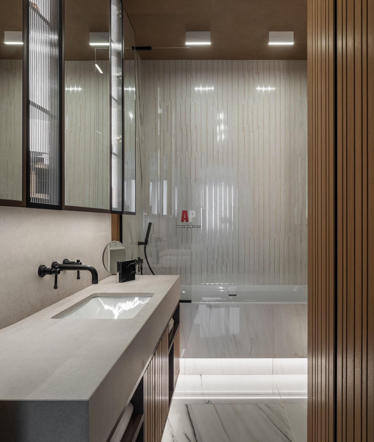 Хозяйский санузел. Керамогранит, Atlas Concorde. Ванна, Villeroy & Boch. Глянец керамогранита смягчает дерево индивидуальных изделий.