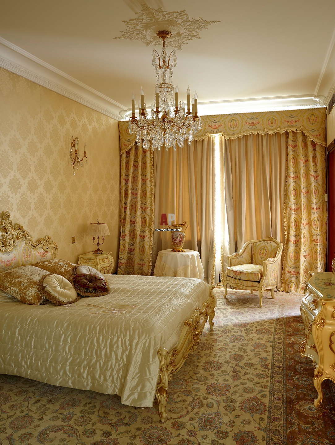 Стены спальни декорированы натуральным шёлком фабрики Lelievre. Шторы с вытканными цветочными медальонами – реплика исторического текстиля времен Марии-Антуанетты. Мебель Fratelli Radice.