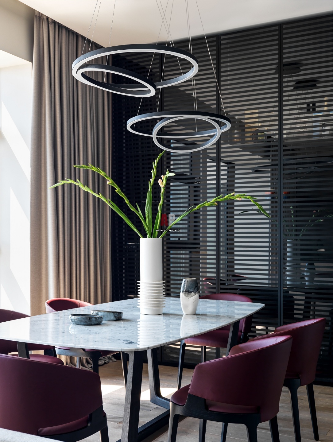 У черных реечных шкафов на заднем плане было несколько «тестовых» версий с разной шириной и разным материалом реек. Фасады имеют высоту 3 м, они выполнены из цельного стекла, очень тяжелые и узкие. Дверцы распашные, на скрытых петлях. Изготовить такую конструкцию, избегая деформаций, было непросто.