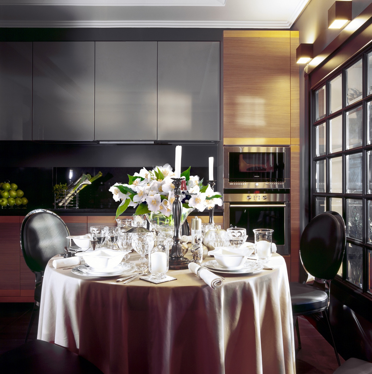 Лаконичный кухонный гарнитур Aurora представлен в двух вариантах отделки: в панелях из серебристого лака и палисандра.