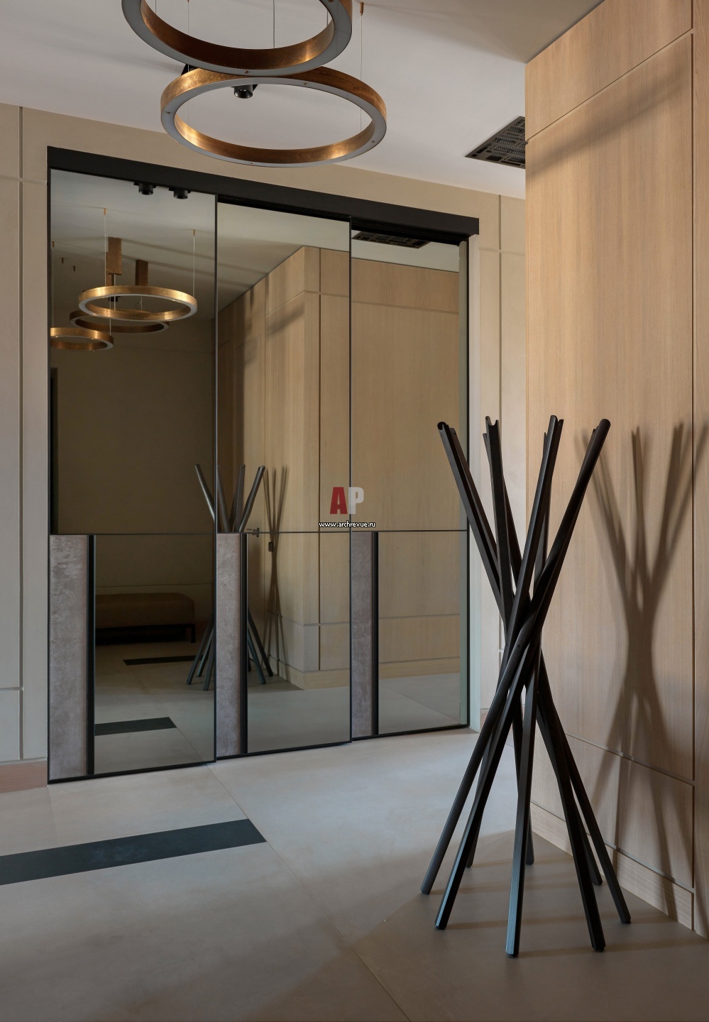 Интерьер прихожей. Зеркальный шкаф, Longhi. Светильники в виде нимбов, Henge, модель Light Ring. На полу – бесшовный керамогранит с фактурой бетона размером 150х300 см и толщиной 6 мм.