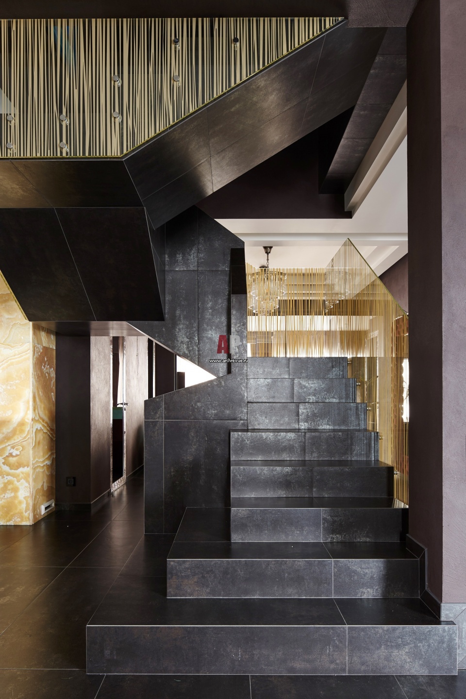 Семейный дом с брутальной лестницей в виде каменной глыбы.