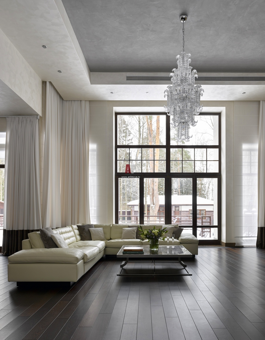 Интерьер гостиной с панорамными окнами. Потолок отделан декоративной штукатуркой под бетон.