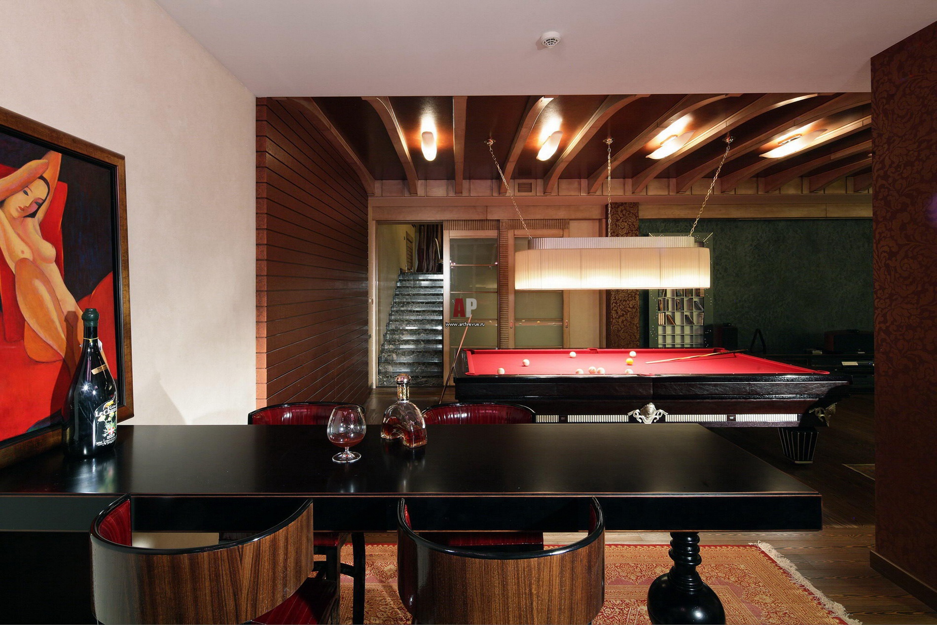 Потолок и стены бильярдной оформлены фигурными балками. Бильярд Florence Collections.