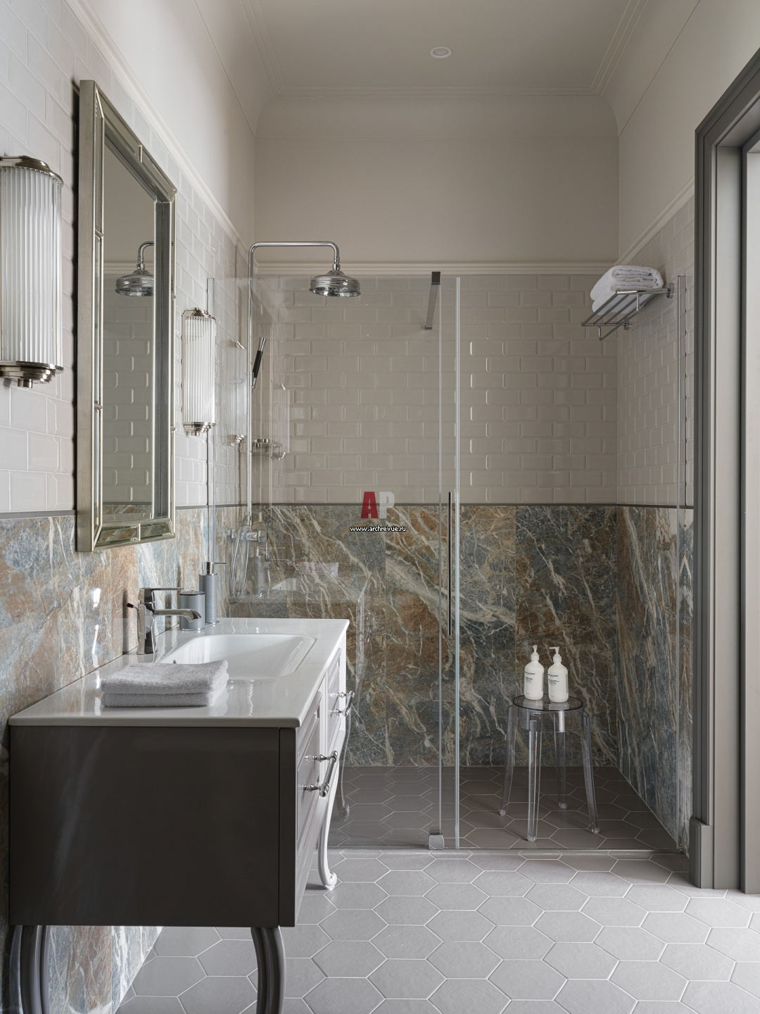 Ванная комната дочери. В отделке использован мрамор и белая керамическая плитка