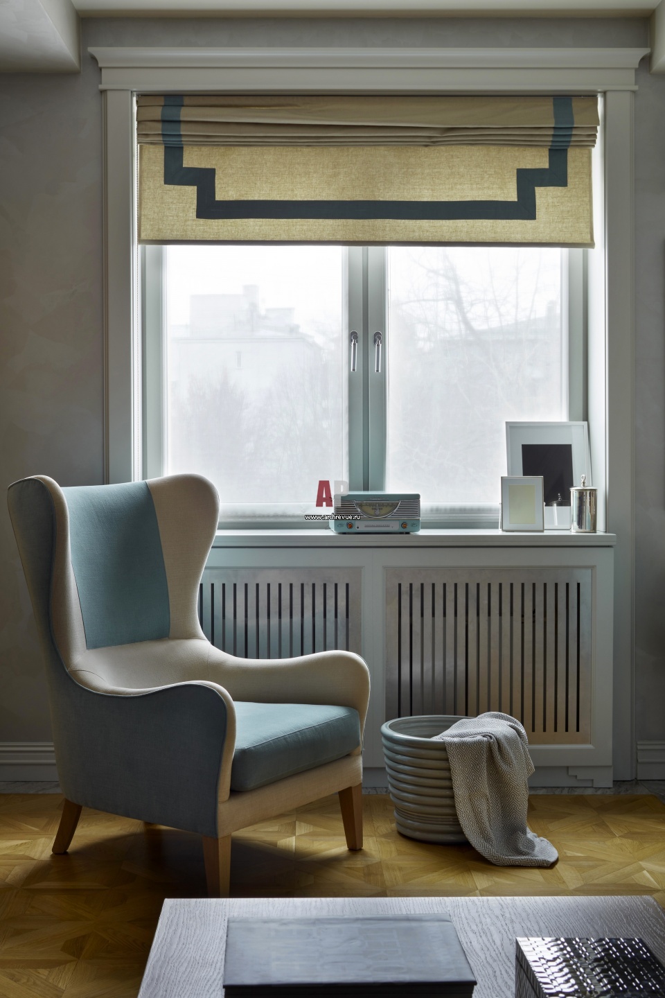 Зона отдыха у окна. Решетки для радиаторов сделаны на заказ из светлого дерева с металлическими вставками. Кресло, Marie's Corner.