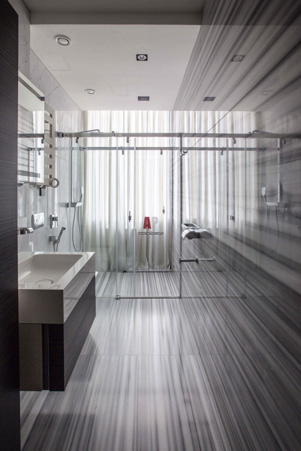 В гостевом санузле стены и пол выложены серым мрамором с рисунком в полоску.