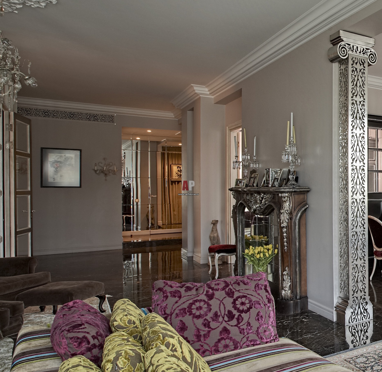Портал камина в стиле французской классики. На полах всех гостевых помещений – итальянский мрамор сорта «Пьяцца».