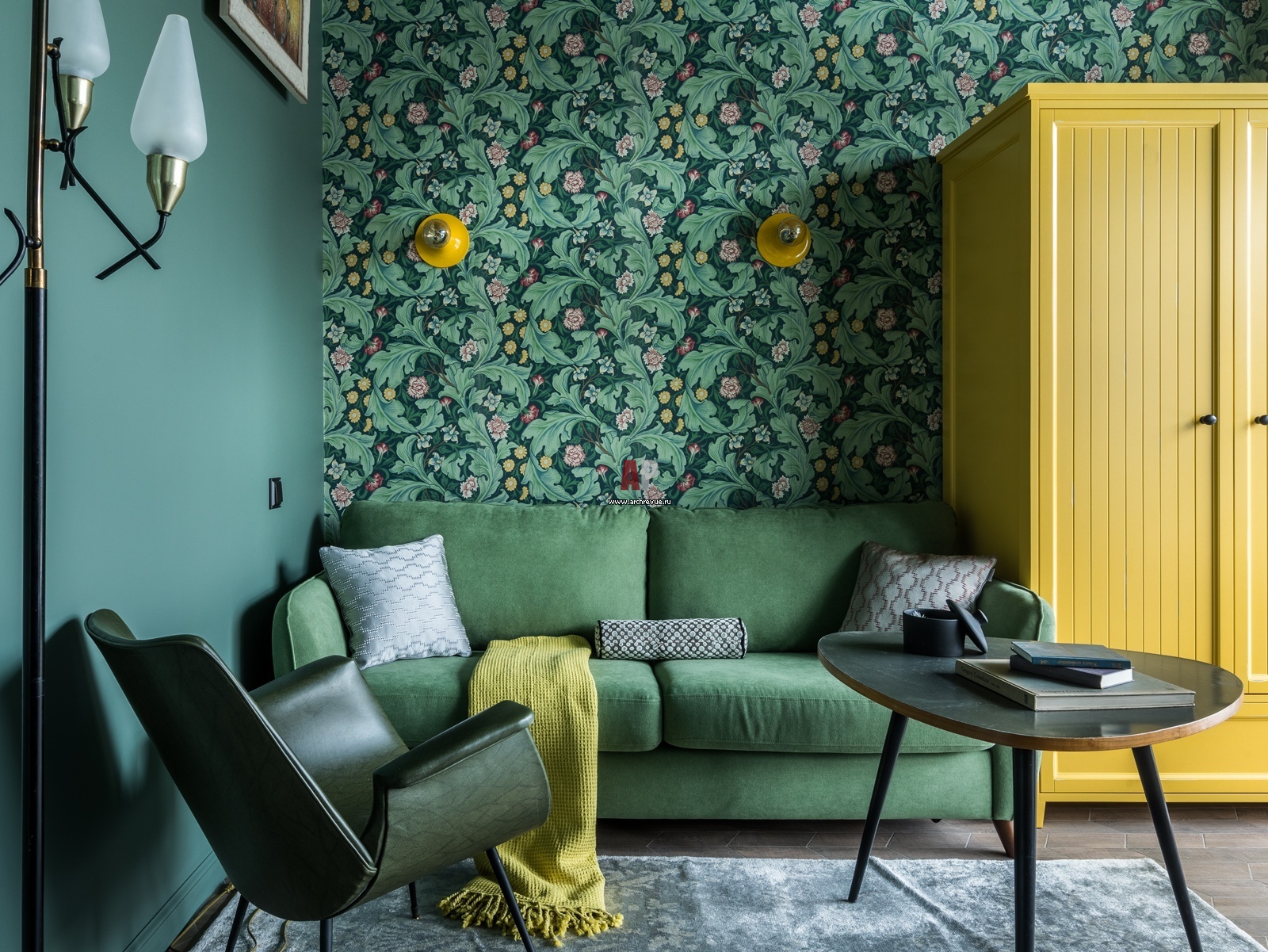 Диванная группа в зеленом кабинете. Обои за диваном, Morris & Co. Желтый шкаф сделан на заказ. Кресло, столик, торшер и желтые бра, винтаж.