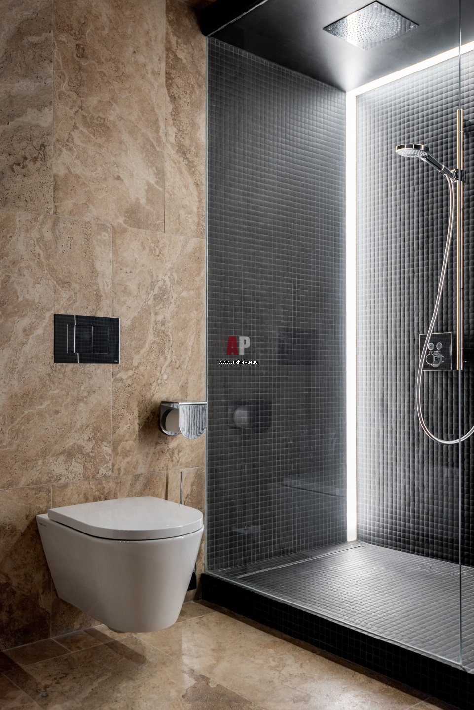 Санузел. Стены оформлены травертином. С ним контрастирует черная керамика отделки душевой. Сантехника, Laufen.