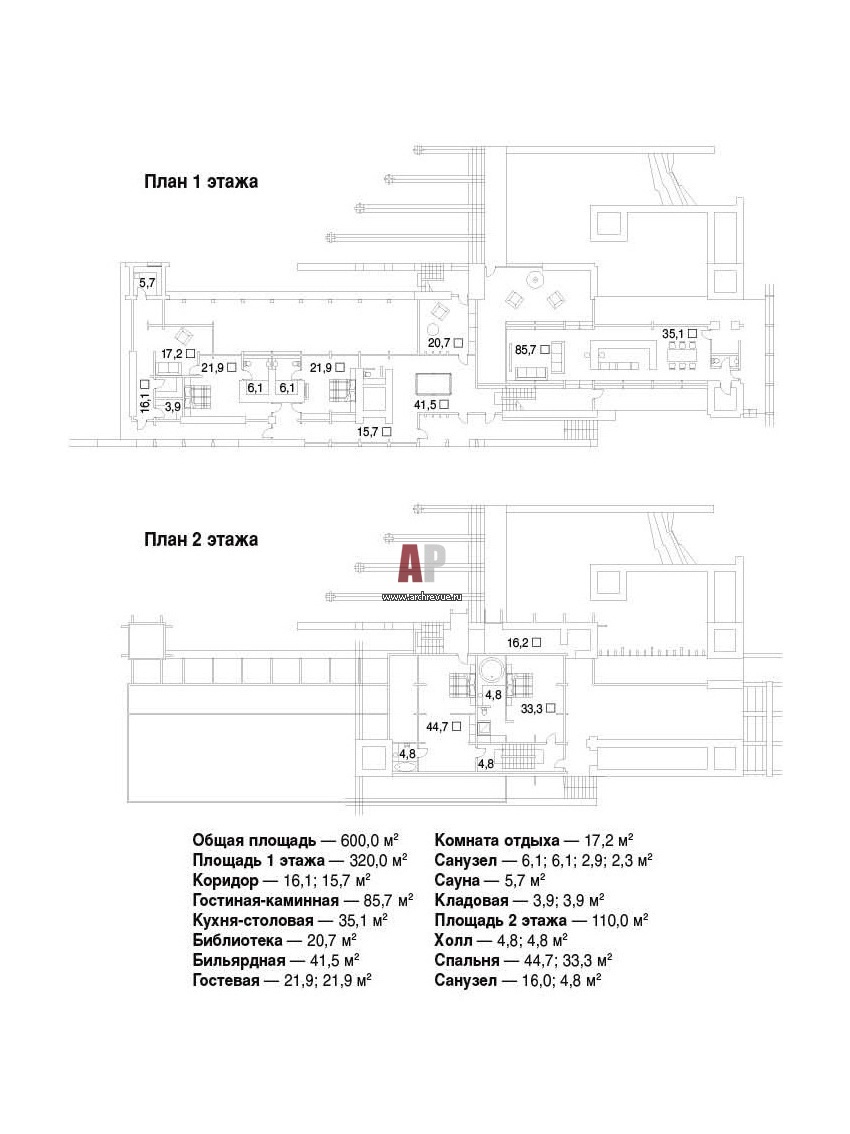 План двухэтажного дома на склоне холма. Общая площадь: 600 кв. м.