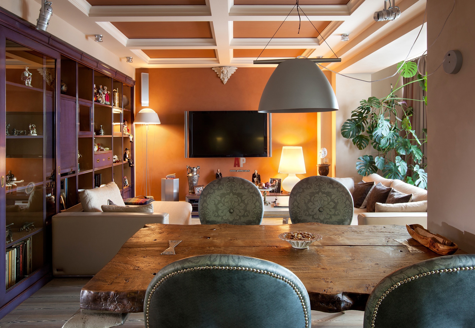 Фото интерьера столовой квартиры в стиле фьюжн с предметами искусства