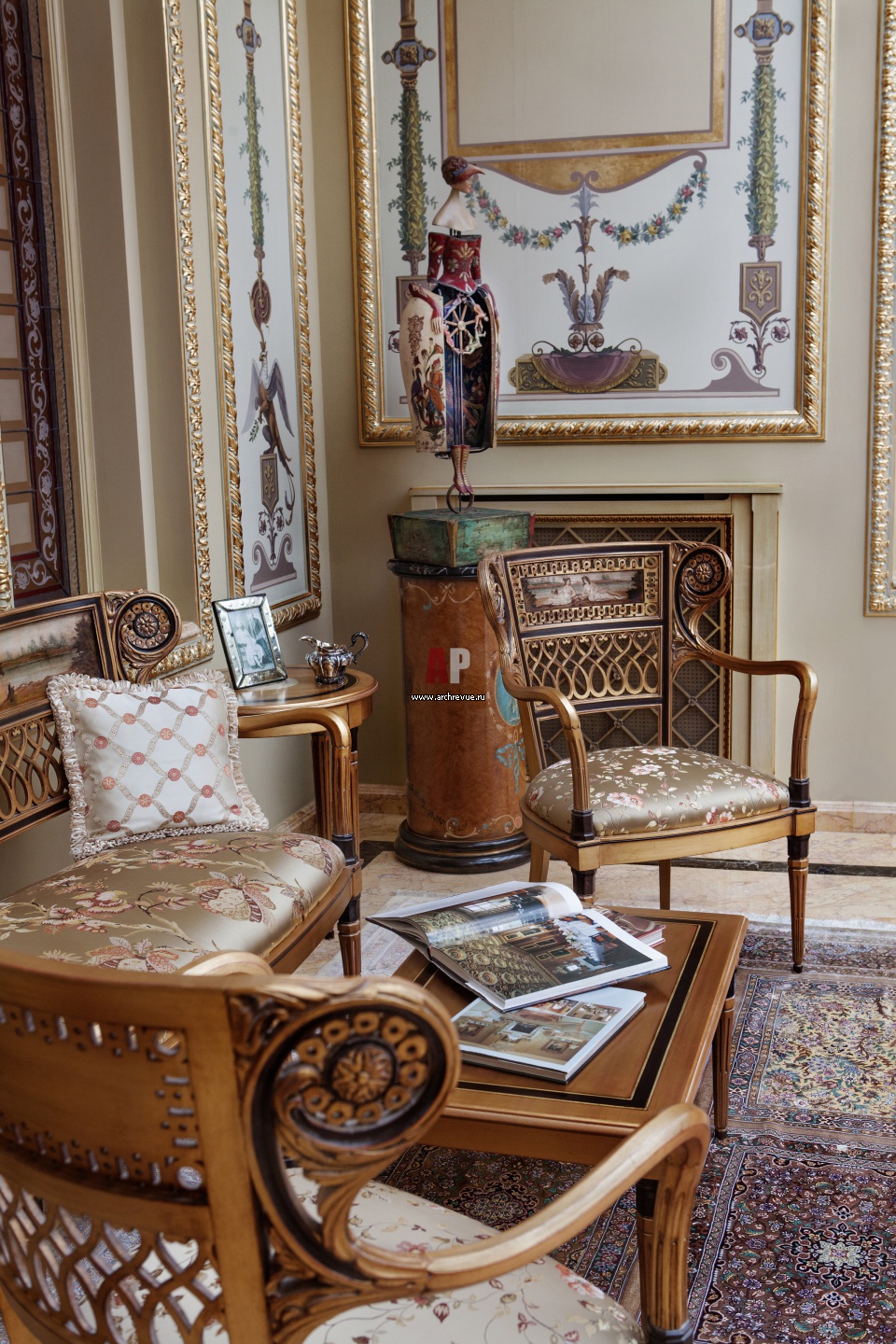 Игровой салон перед бассейном. Стены украшены гротесковой живописью. Мебель от Galimberti Lino с античными мотивами вручную расписана сценами из греческой мифологии.