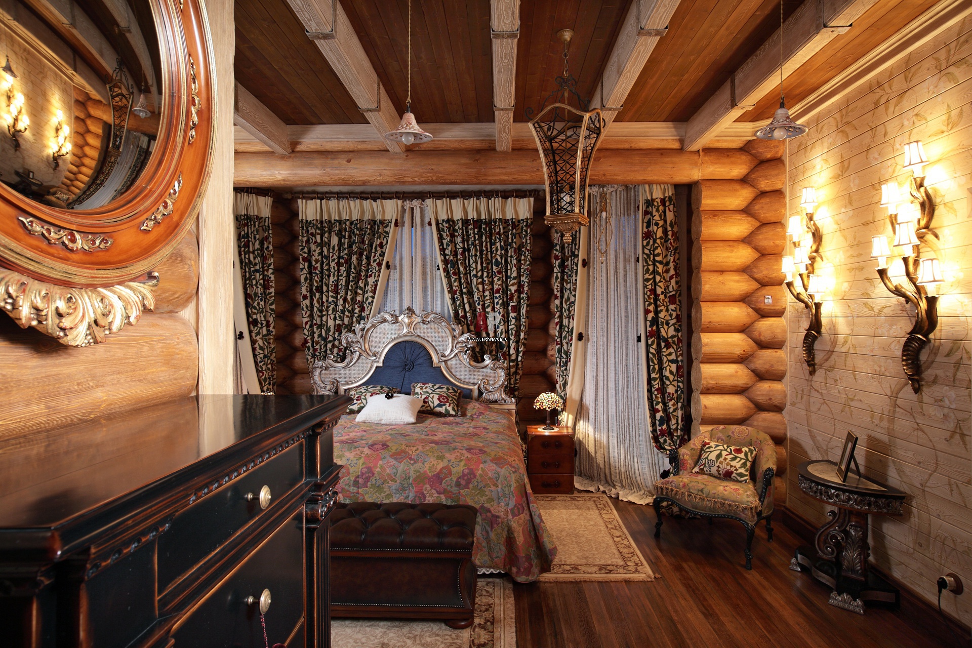 Интерьер спальни в фольклорном стиле в древенчатом доме. Текстиль в духе sweet&honey. Стены зашиты сосновой докой с росписью, потолочные балки декоративные.