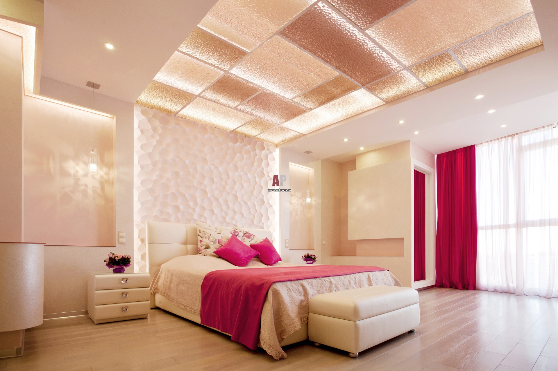 Интерьер хозяйской спальни в песчано-лиловых тонах. Большой витраж-светильник над кроватью дает мягкий, камерный свет. Массивная доска, ясень «Баунти» с перламутровым финишем, поставщик «Мир Паркета». Стена за изголовьем кровати - 3D-панели, покрытые перламутровой краской. Кровать, Dream Land.