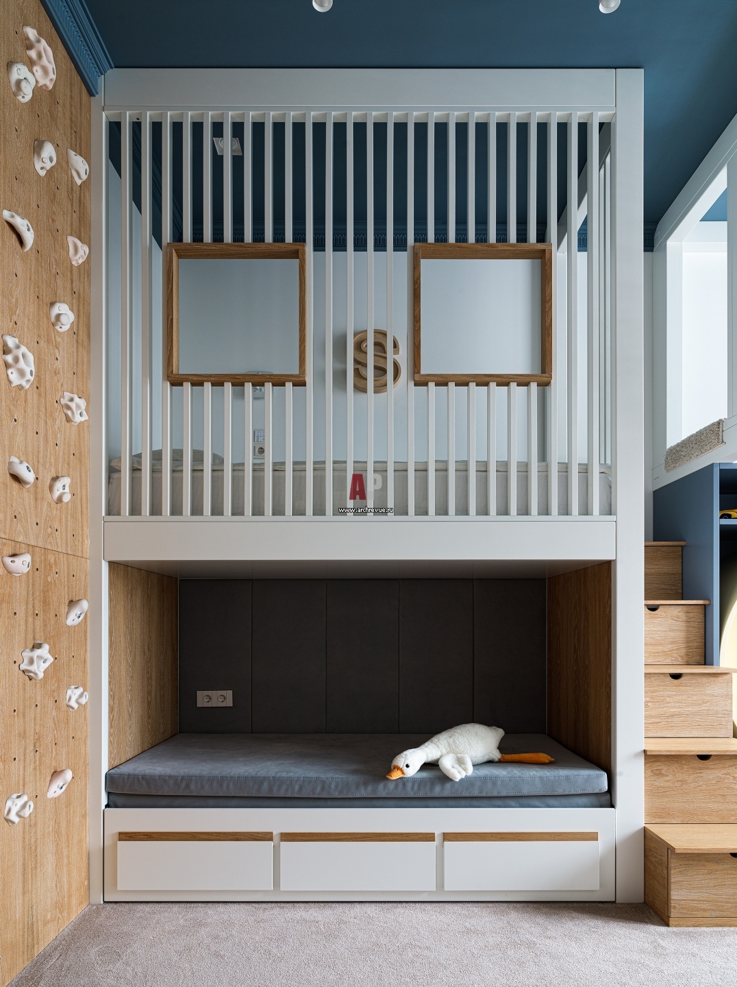 Двухъярусная кровать и вся мебель в детской сделаны на заказ.