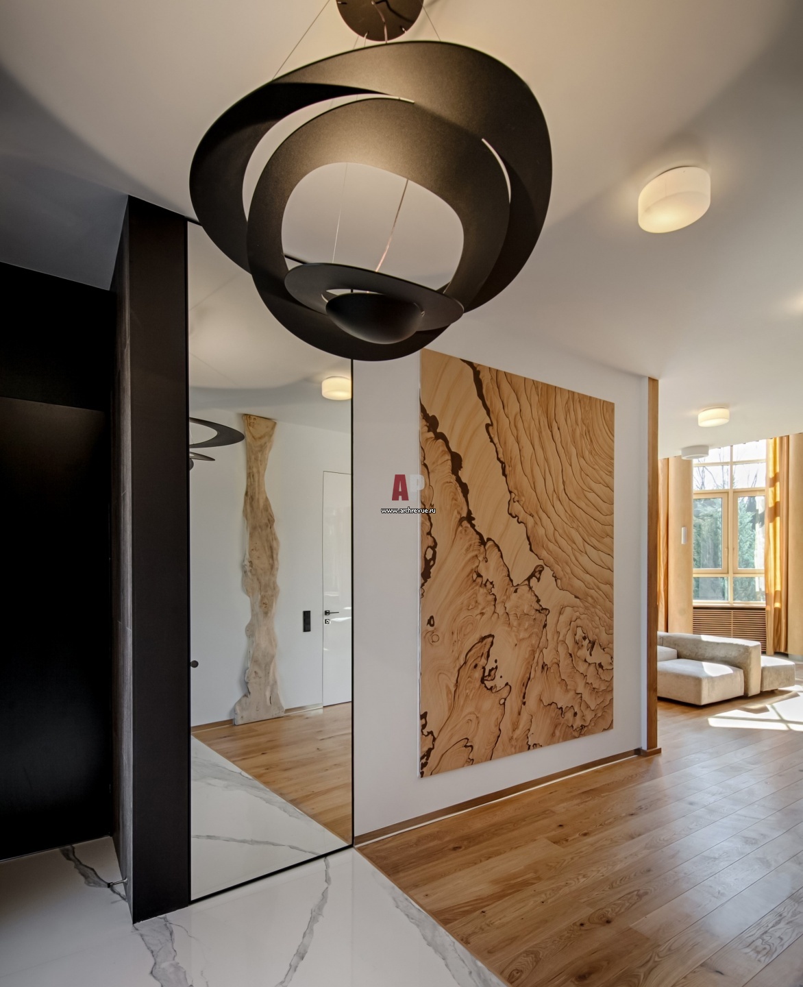 Зеркала, белые стены и потолок визуально растворяют стены, объединяя пространство первого этажа. Черная люстра служит контрастным акцентом.