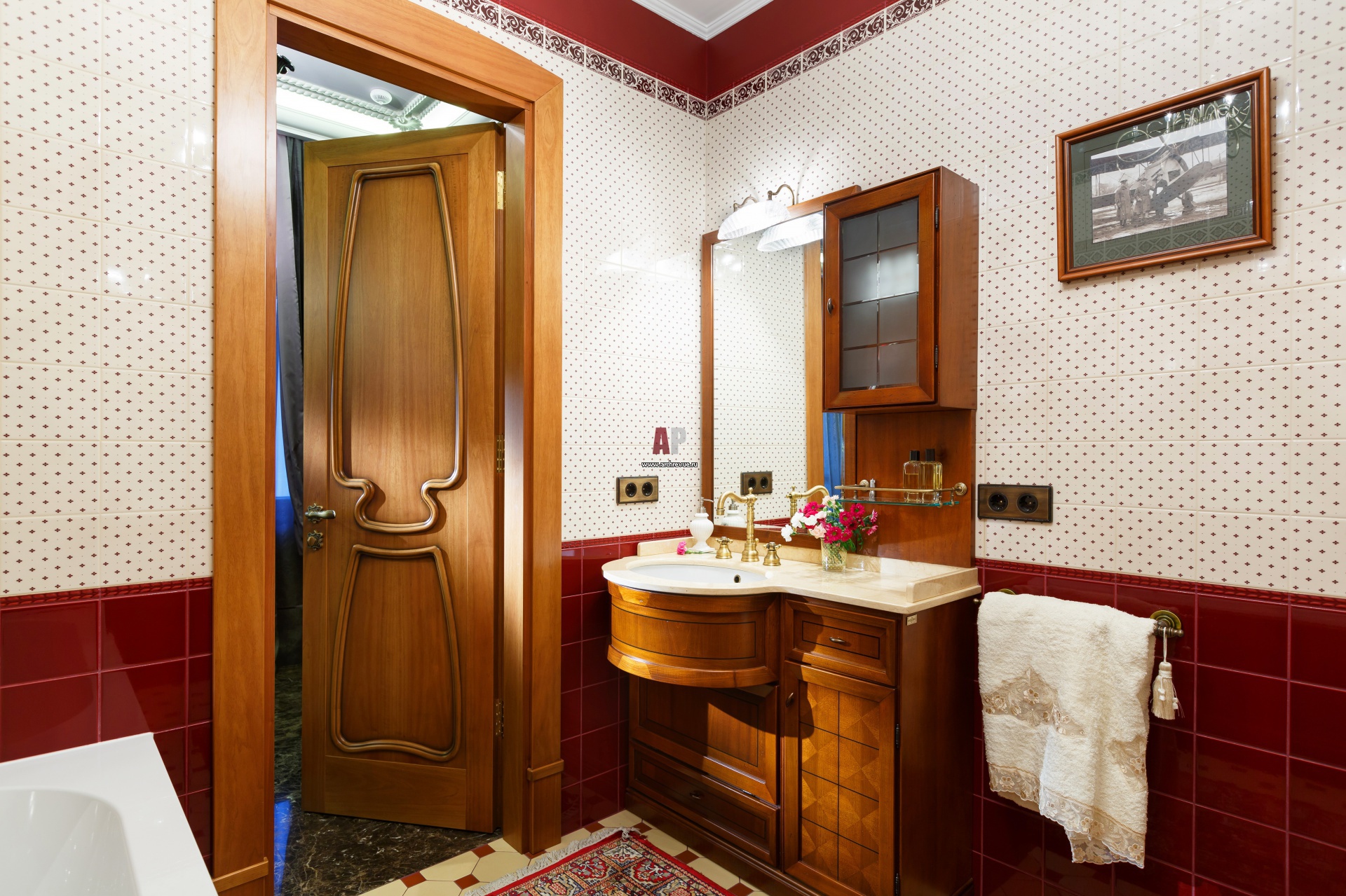 Интерьер гостевого санузла. Керамическая плитка Original Style уложена с имитацией буазери. Низ облицован яркой брусничной плиткой, верх – белой с мелким орнаментом. Раковина, Villeroy & Boch.