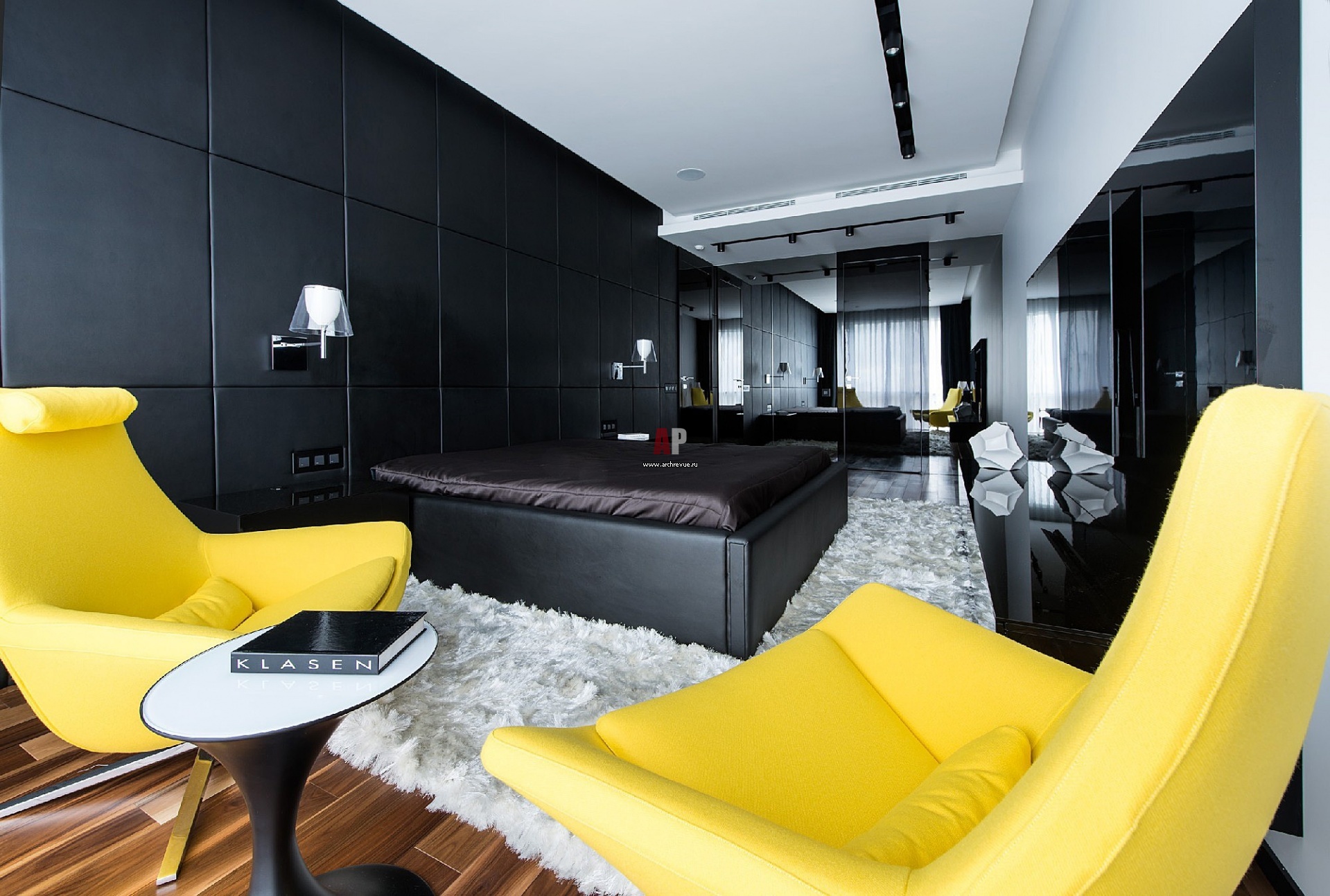 Яркие акценты в монохромном интерьере спальни – кресла B&B Italia из кожи насыщенного желтого цвета.