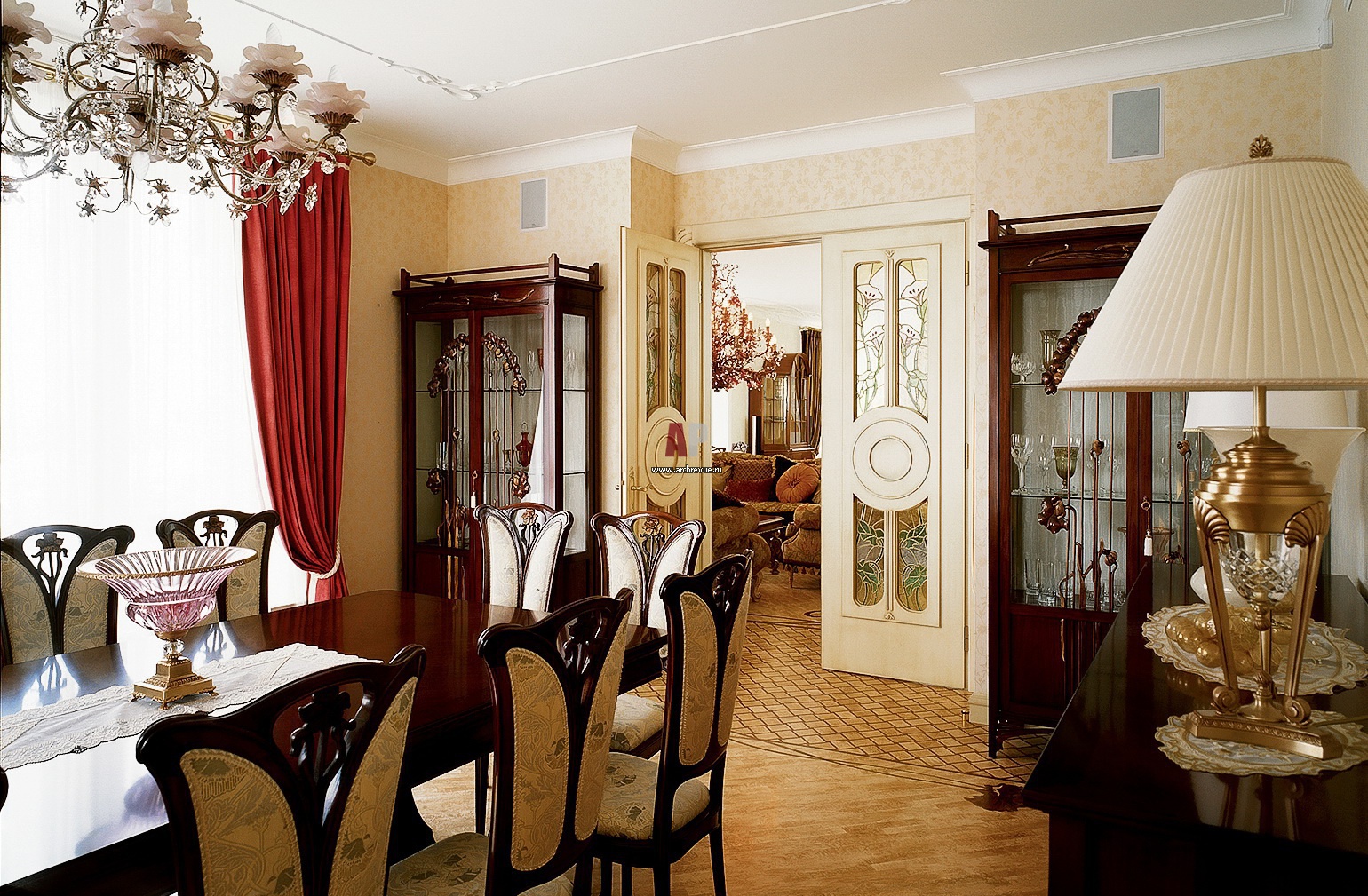 Столовая группа в стиле модерн. Горки, стол и стулья сделаны итальянскими мастерами фабрики Medea для интерьеров в стиле русского модерна.