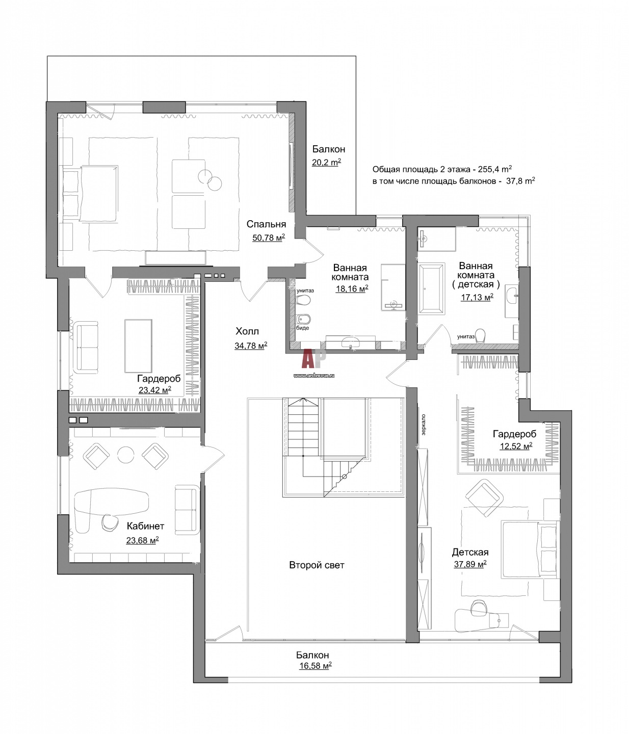 План второго этажа реконструкции двухэтажного дома в Калининграде. Общая площадь - 450 кв. м.
