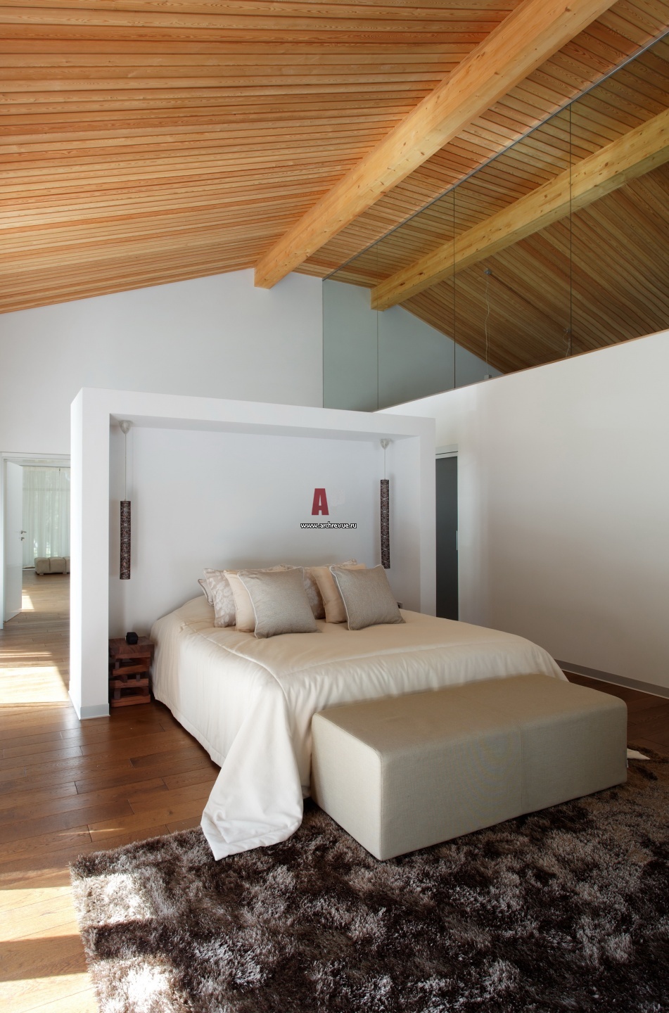 Потолок в хозяйской спальне подшит лиственницей. Кровать, B&B Italia.