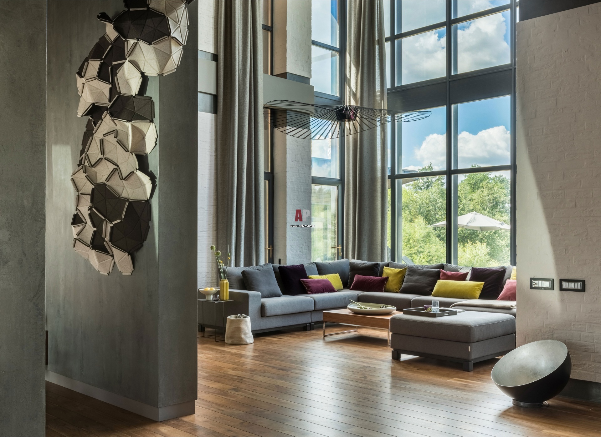 Основная гостиная расположена в двухсветном объеме первого этажа. Архитекторы почти не меняли планировку, но избавились от отдельно стоящих шкафов, которые перегораживали пространство. Теперь первый этаж выглядит единым, цельным, воздушным помещением.