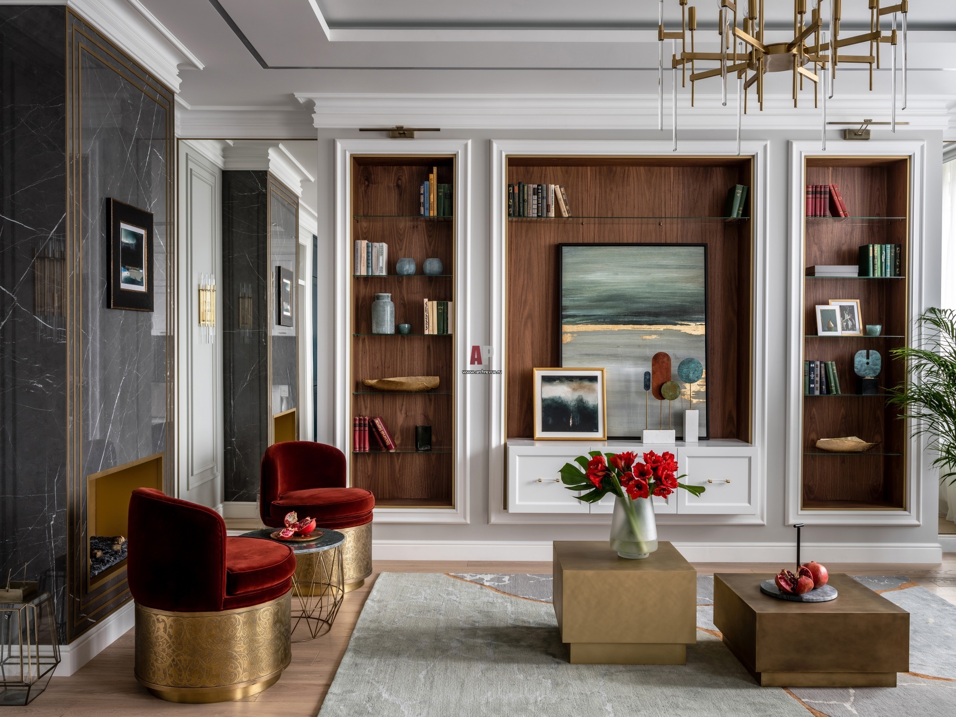 Гостиная с каминной группой решена в духе современной классики. Люстра, Hudson Valley Lighting, модель Bari.