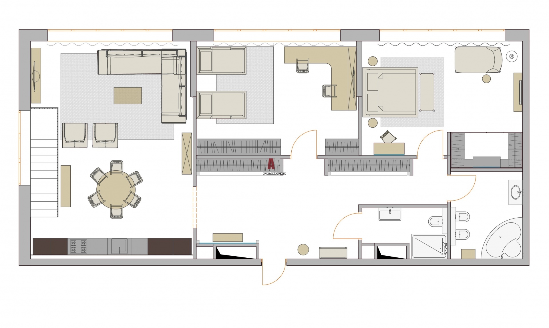 План семейного пентхауса с террасой на 25 этаже новой высотки в Краснодаре. Общая площадь – 230 кв. м.