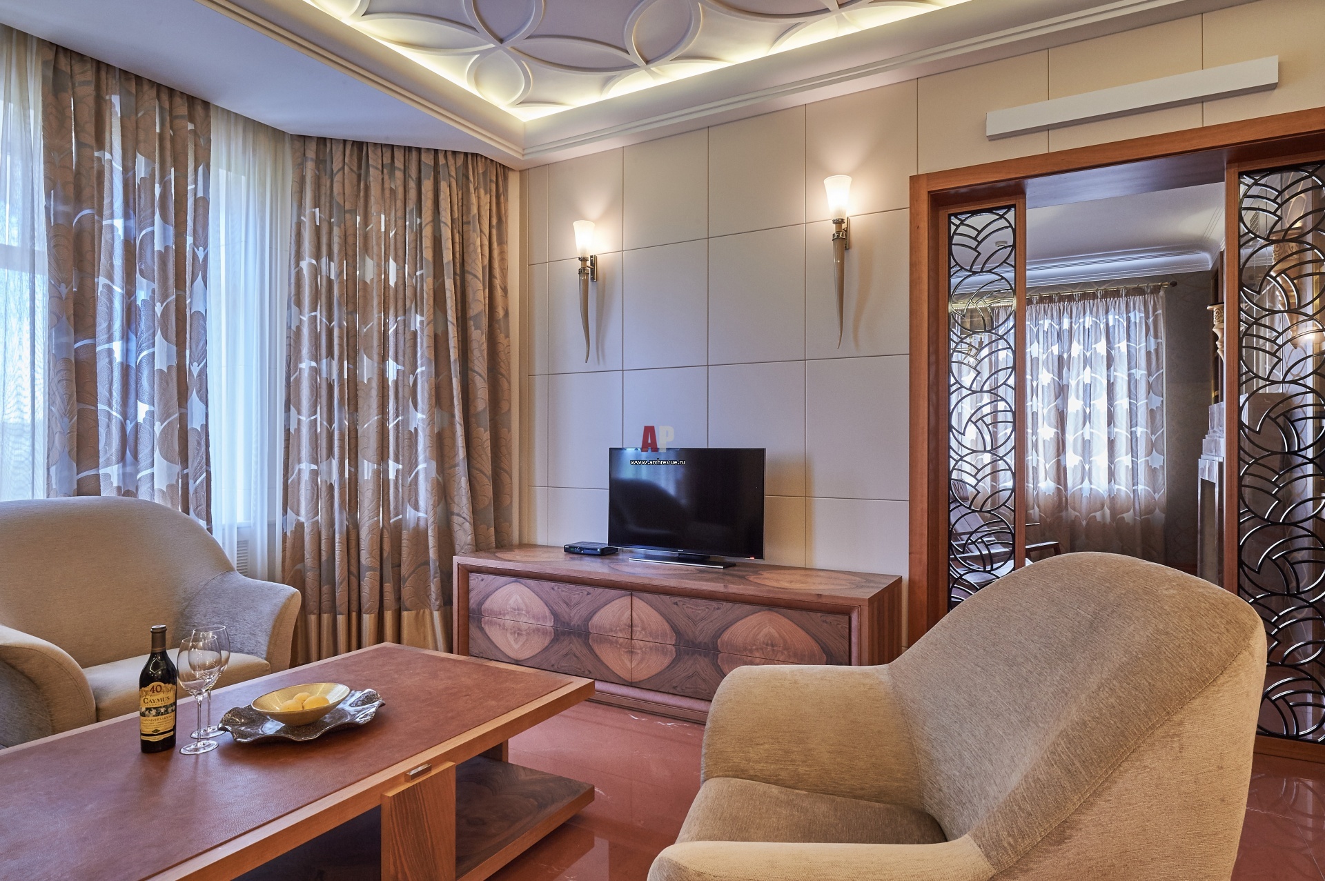 Интерьер гостиной в стиле сдержанного ар-деко. Стены зашиты панелями из МДф с однотонным окрашиванием в молочно-бежевый цвет. Панелями размером 60Х45 см зашиты от пола до потолка. Комод, журнальный столик, кресла, Smania.