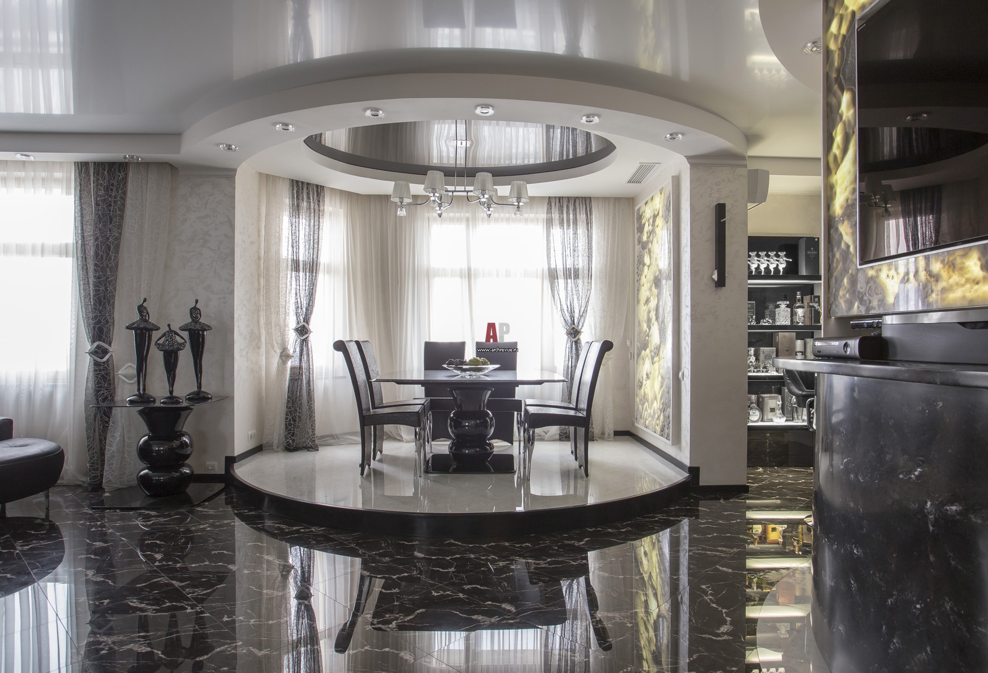 Столовая группа расположена на в полукруглом эркере и вынесена на небольшой радиусный подиум. Его поверхность облицована светло-серым керамогранитом и контрастирует с фактурой темного камня на полу. Обрамление плазменного экрана и панно в торце столовой выполнено из мрамора «Капучино», при выключенном свете он серый, при включенной подсветке – желто-дымчатый.
