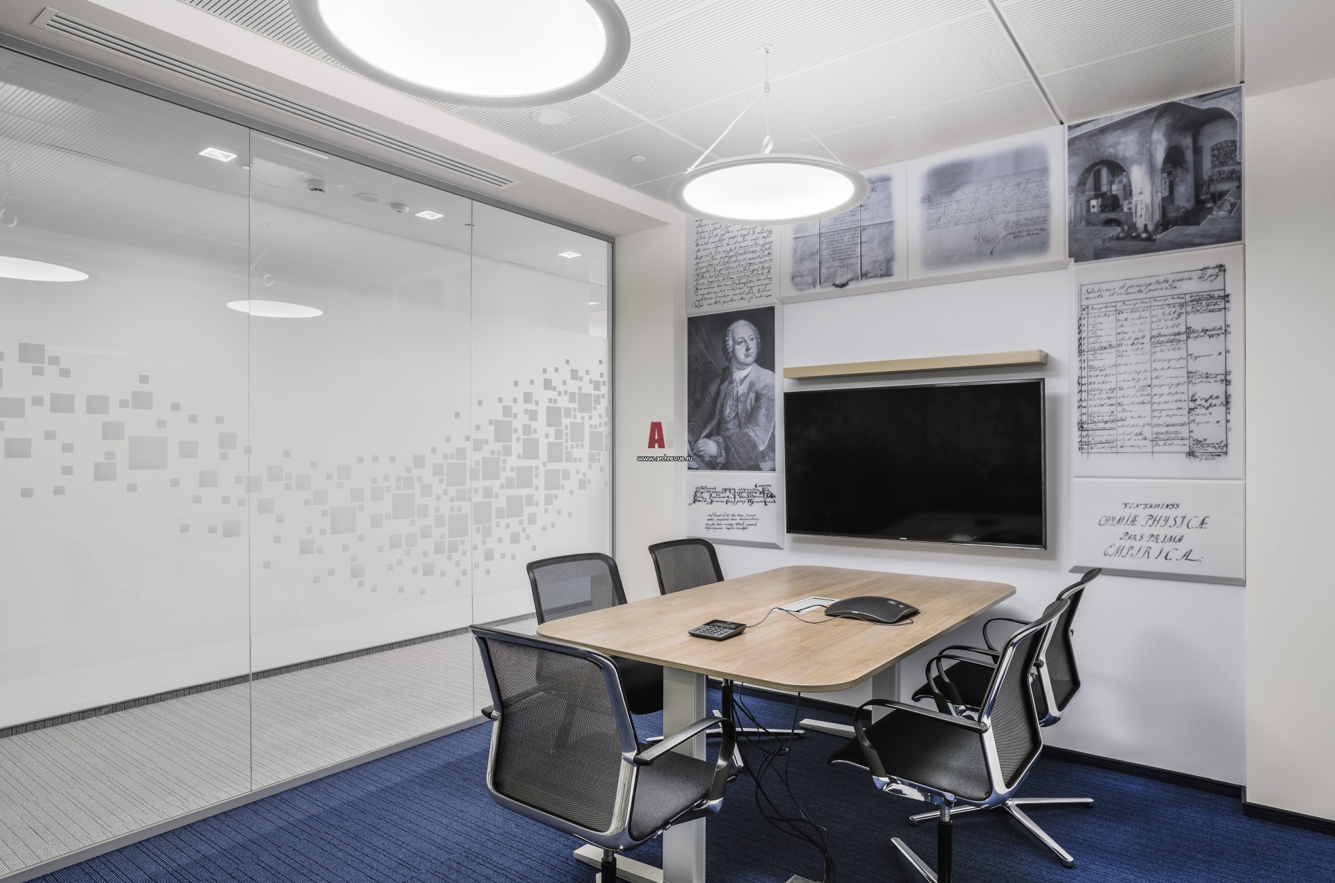 Интерьер офиса в тиле минимализм. В качестве декора использована печать фотографий ученых-химиков и тема химических элементов.