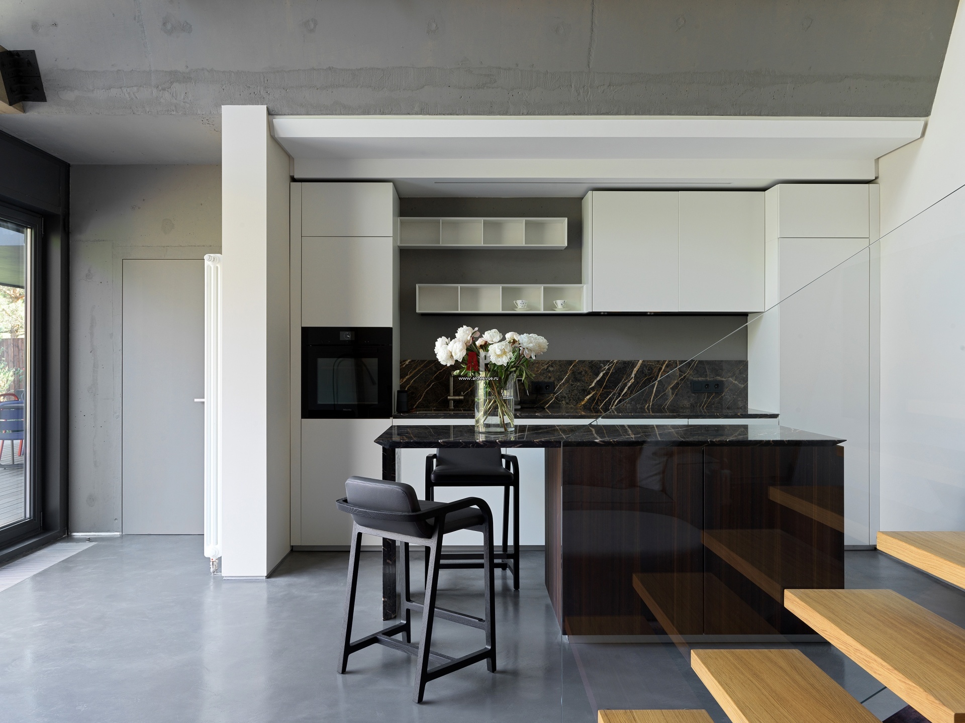 Кухня встроена в нишу. Кухонная мебель в матовом лаке с островом из шпона эвкалиптового дерева, Zampieri. Фартук из мрамора Port Laurent. Барные стулья из брашированного чёрного дуба и кожи, B&B Italia, модель Fulgens.