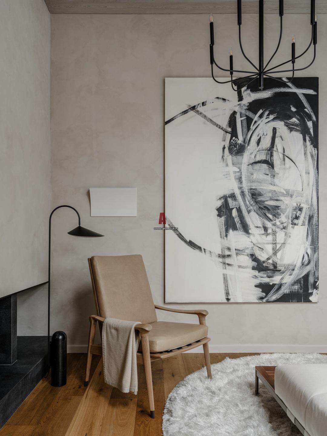 Главная спальня в мансарде. Кресло, Giorgetti. Торшер, Ferm Living. Картина Юлики Незванкиной.
