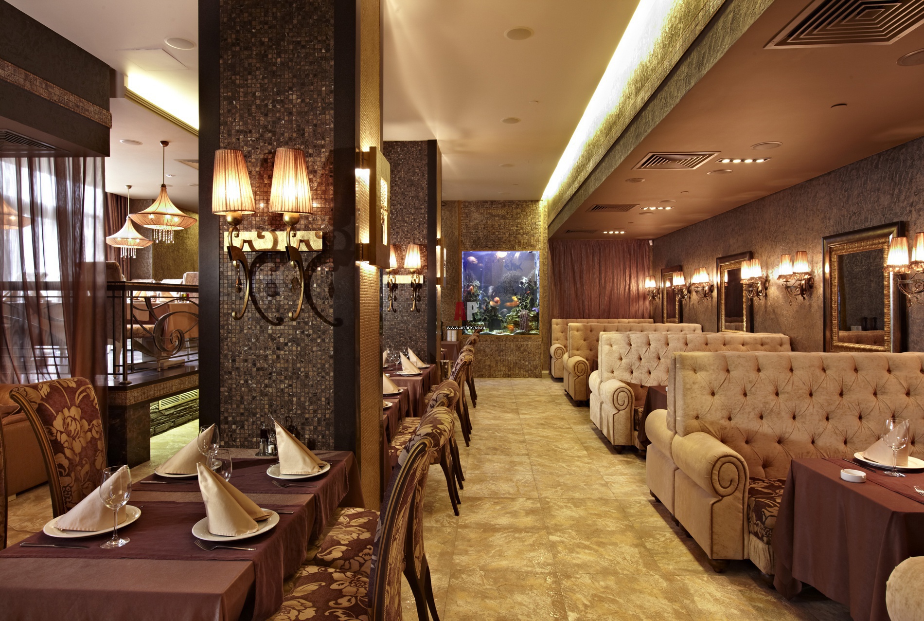 Вытянутое вдоль фасада помещение зонировано подиумом и разными видами обеденных групп. К стенам придвинуты массивные диваны, изготовление Beni, а центральную часть занимают столы со стульями.