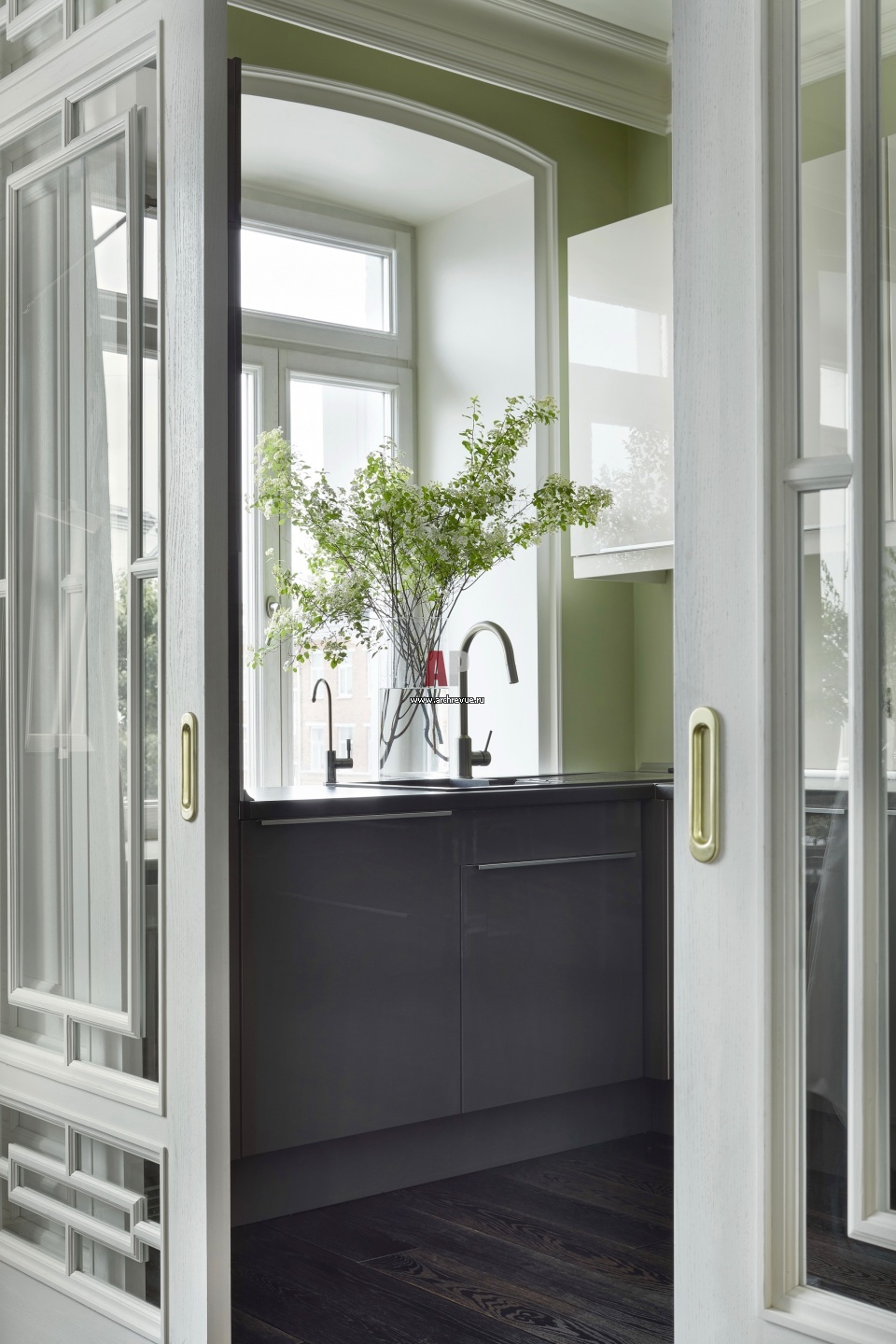 Особенность дома – выразительные окна и особый старомосковский шарм, присущий дореволюционной архитектуре. Оригинальный рисунок оконных проемов и рам дизайнер бережно сохранила. Фрагмент небольшой, но функциональной, кухни.