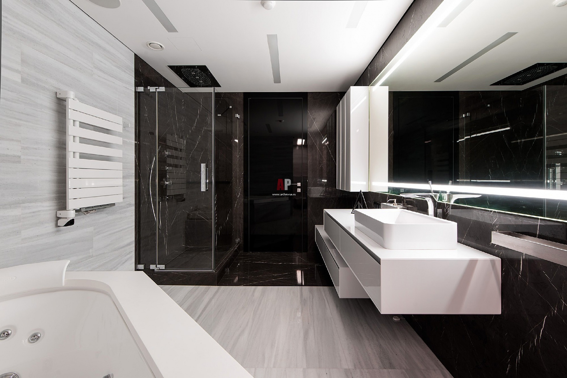 Интерьер хозяйского санузла строится на контрасте светлого (зона умывальника и ванной) и темного (душевая) мрамора.