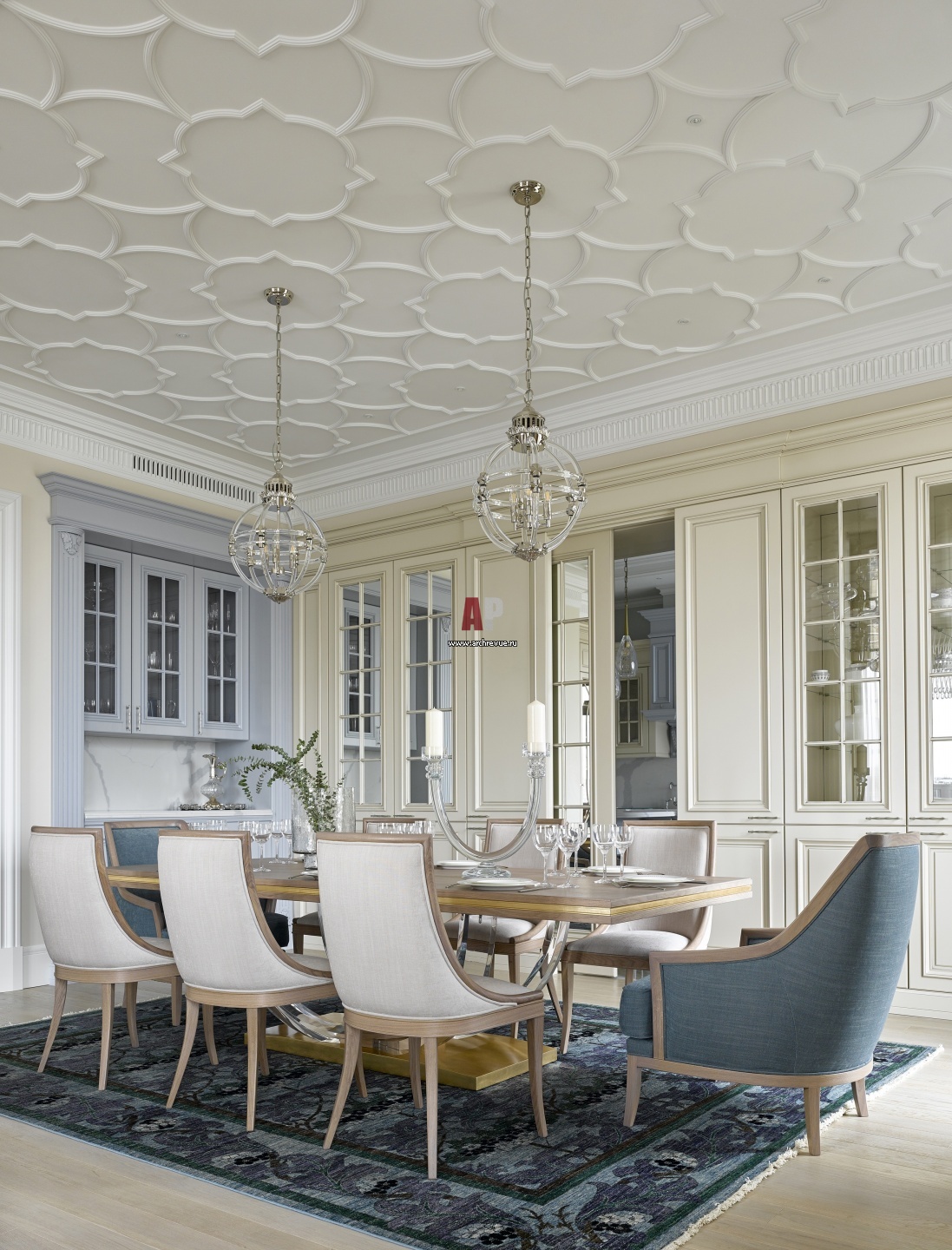 Изначально гостиная, столовая и кухня были единым помещением. Но в процессе концепт изменился, и было решено сделать кухню в восточных традициях с полостью изолированной рабочей зоной. Поэтому кухня заняла место гостевой соседней спальни, а гостиная стала настоящим парадным залом, не загроможденным кухонной мебелью. При этом на общей территории дизайнеры оставили шкафы и витрины для посуды, чтобы обеспечить легкий доступ к ним при сервировке, а рабочую часть кухни отделили раздвижной дверью.