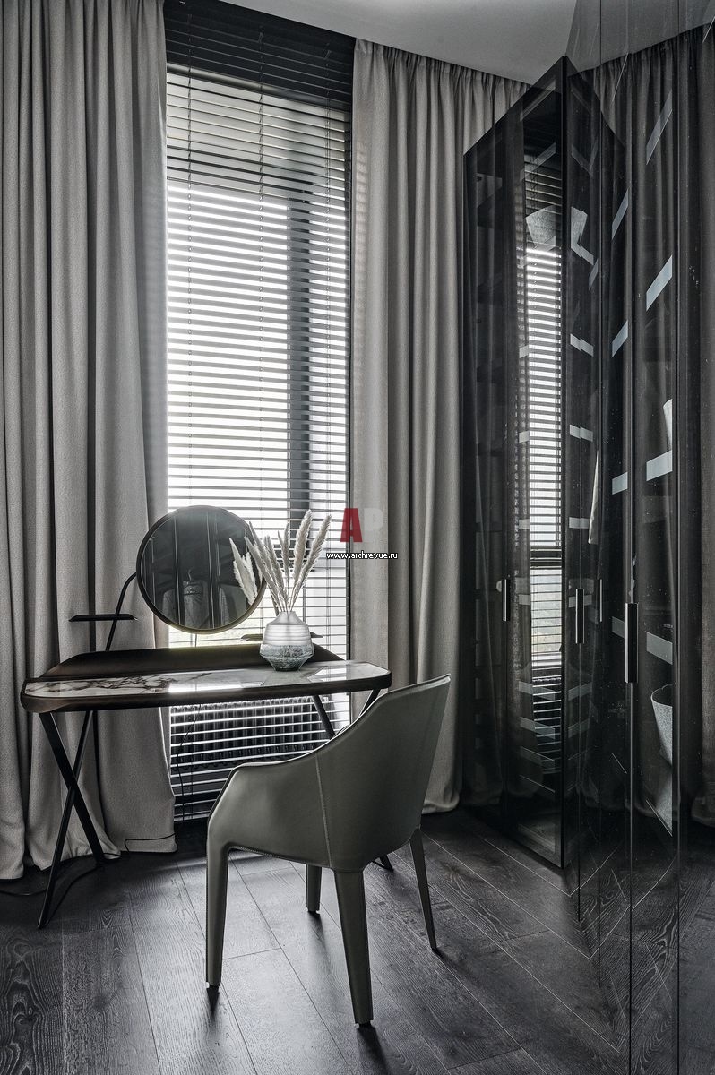 Гардеробная примыкает к скошенной несущей стене и имеет треугольную форму. Вдоль стен размещены стеклянные шкафы. У окна – туалетный столик с мраморной столешницей, Cattelan Italia.
