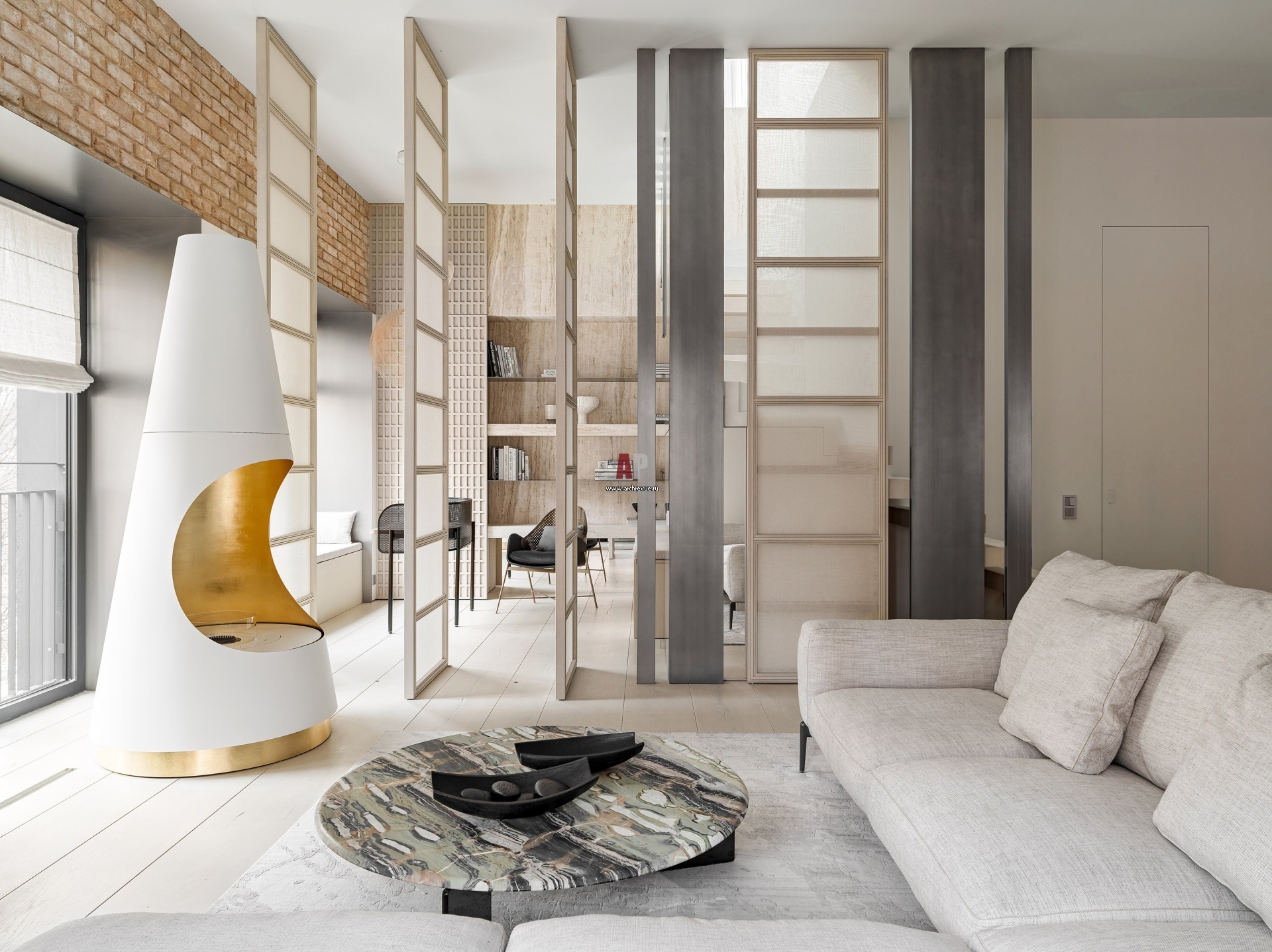 Чтобы сохранить объем и воздух, кабинет от гостиной отделяют поворотные перегородки со смещенной осью вращения. На них интересное решение с использованием ткани и стекла. «Нам хотелось привнести нотку японской культуры и немного смягчить интерьер. Поэтому мы подобрали натуральную ткань, которой оклеили стекла поворотных дверей с двух сторон», -рассказывают архитекторы студии Mops.