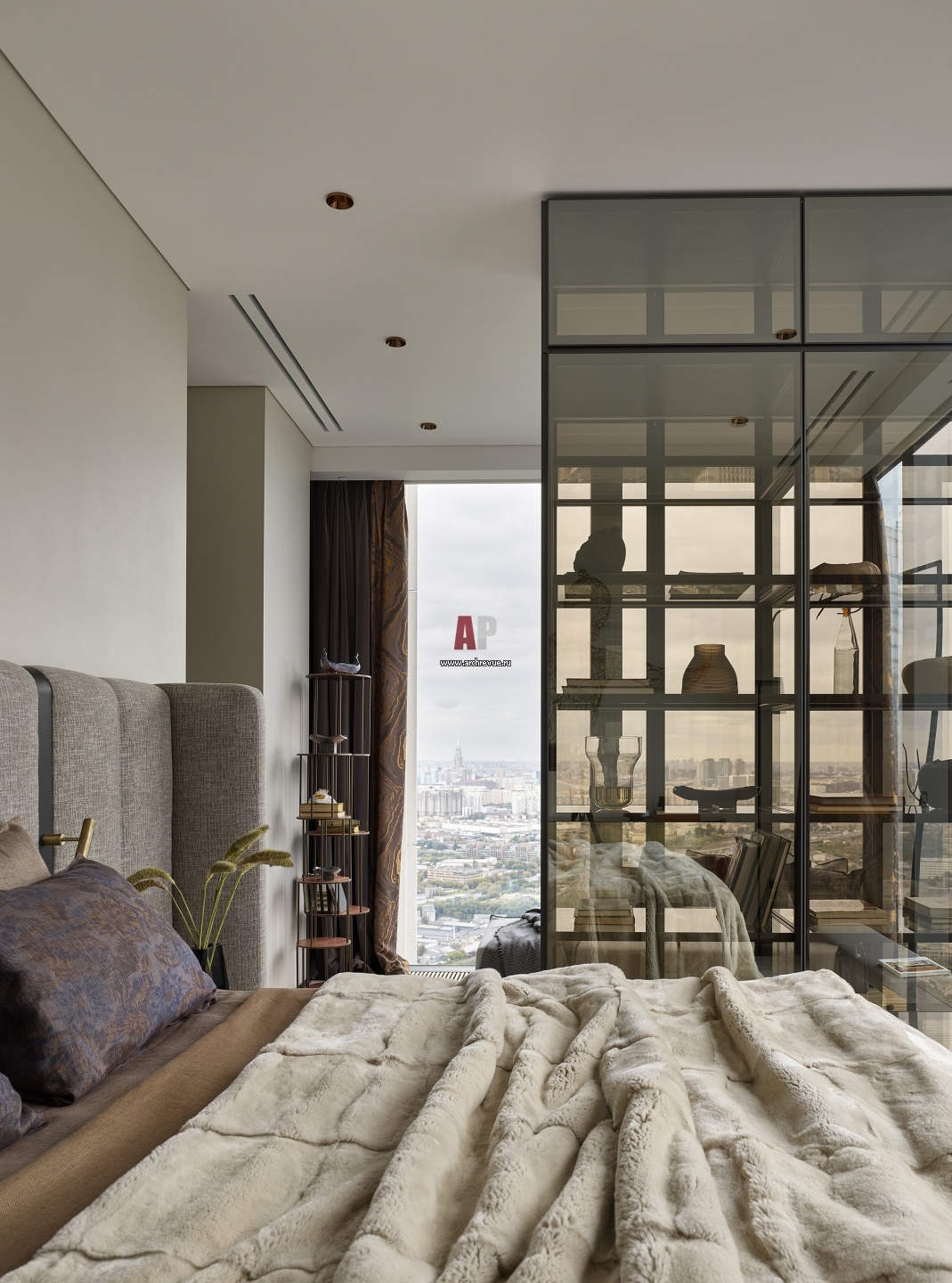 Спальня. Кровать, Porada. Стеклянный стеллаж Molteni&C отделяет мини-гостиную у окна от спальной зоны.