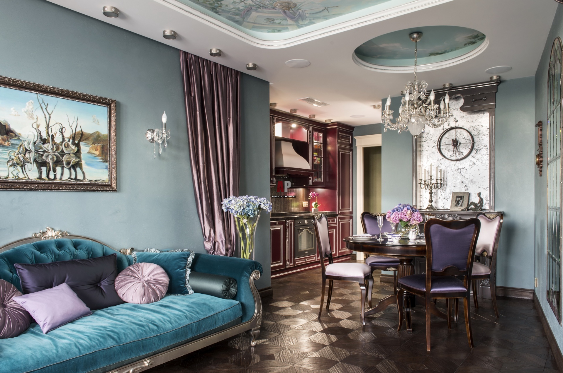 Интерьер гостиной классической гостиной с оформлением в цветах морской волны, сливы, сирени и серебра. Потолки оформлены авторской росписью. Люстра, бра, MMLampadari. Диван, Unico Italia.