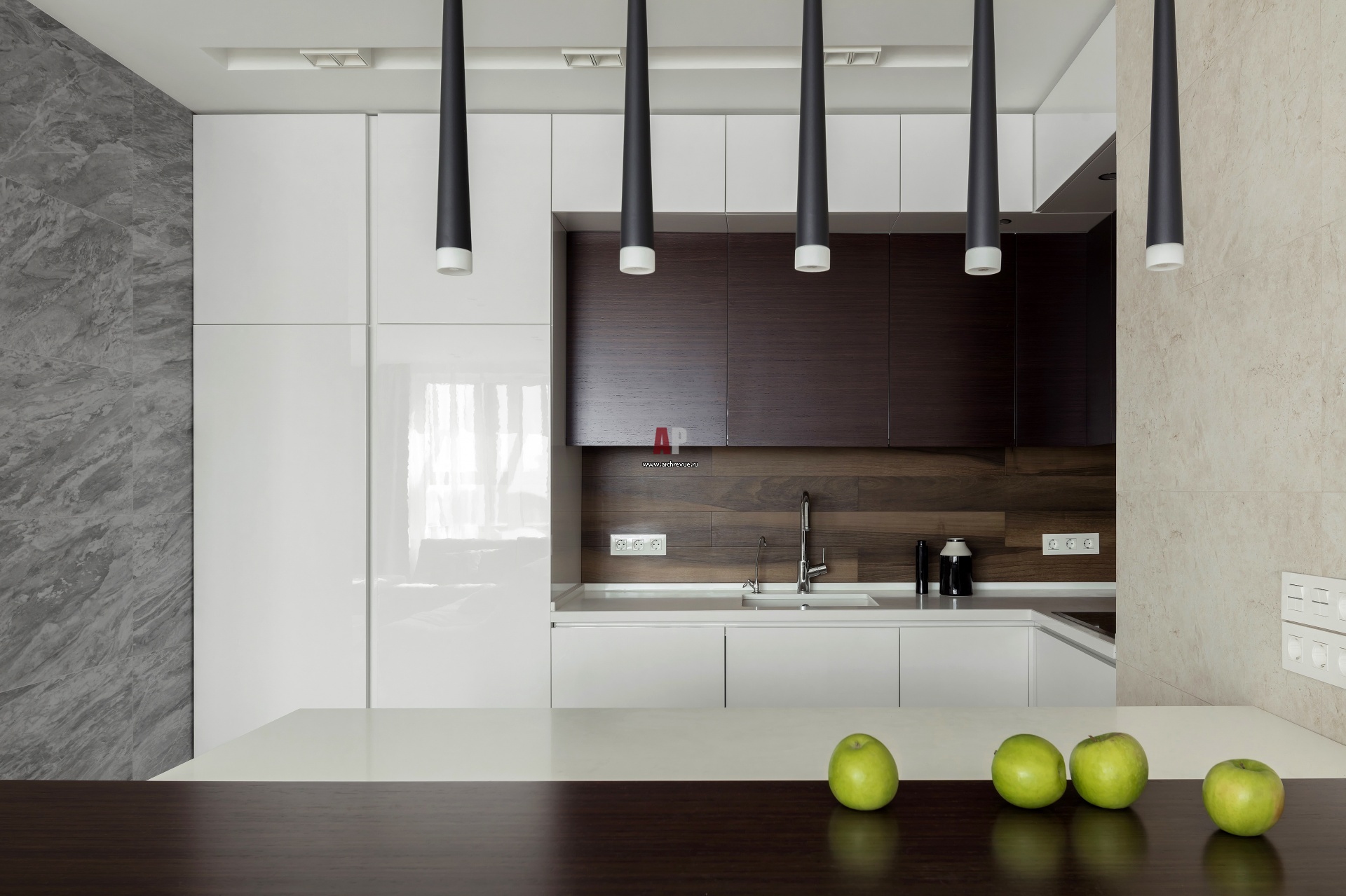 Зона кухни в общей гостиной на первом этаже. Кухонная мебель сделана по эскизам архитектора. Фасады отделаны шпоном венге и покрыты глянцевой эмалью. Столешница барной стойки, шпон венге. Подвесные светильники, Lightstar.