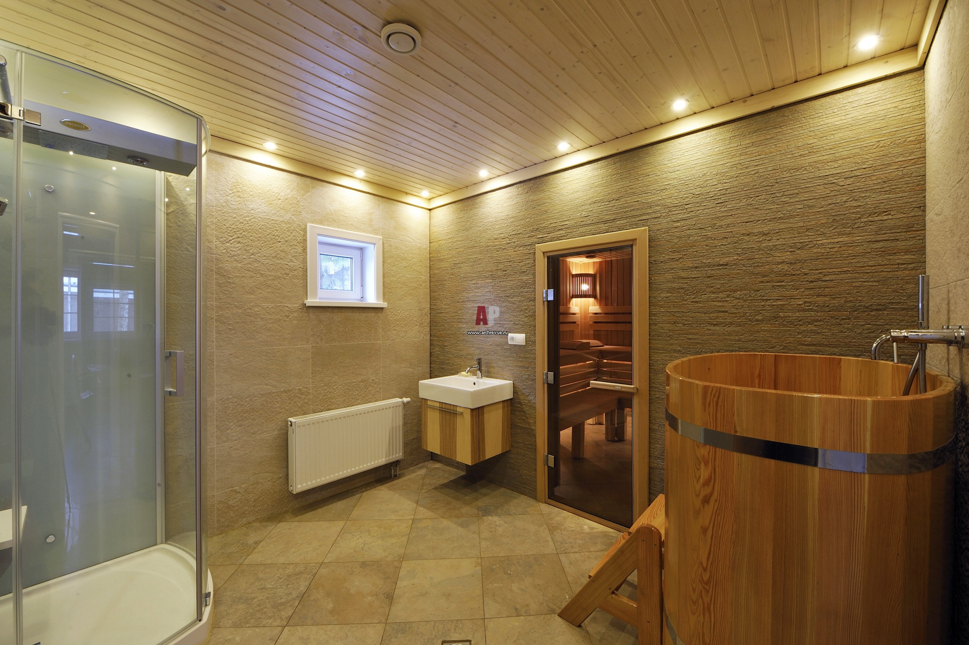 Душевая в банном комплексе оснащена сантехникой Jacuzzi и Hatria. Стены и пол облицованы светлой каменной плиткой с разной фактурой. Одна из них визуально напоминает шероховатую рогожку. Помимо прозрачной душевой кабинки в помещении установлена деревянная бочка, в прохладную воду которой можно окунуться после посещения парной.