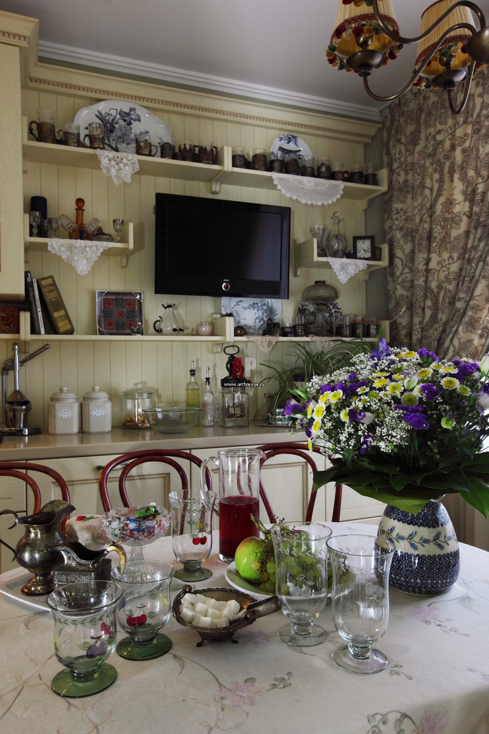 На открытых полках кухни выставлена посуда, мелкая пластика и хозяйская коллекция стаканов в металлических подстаканниках.
