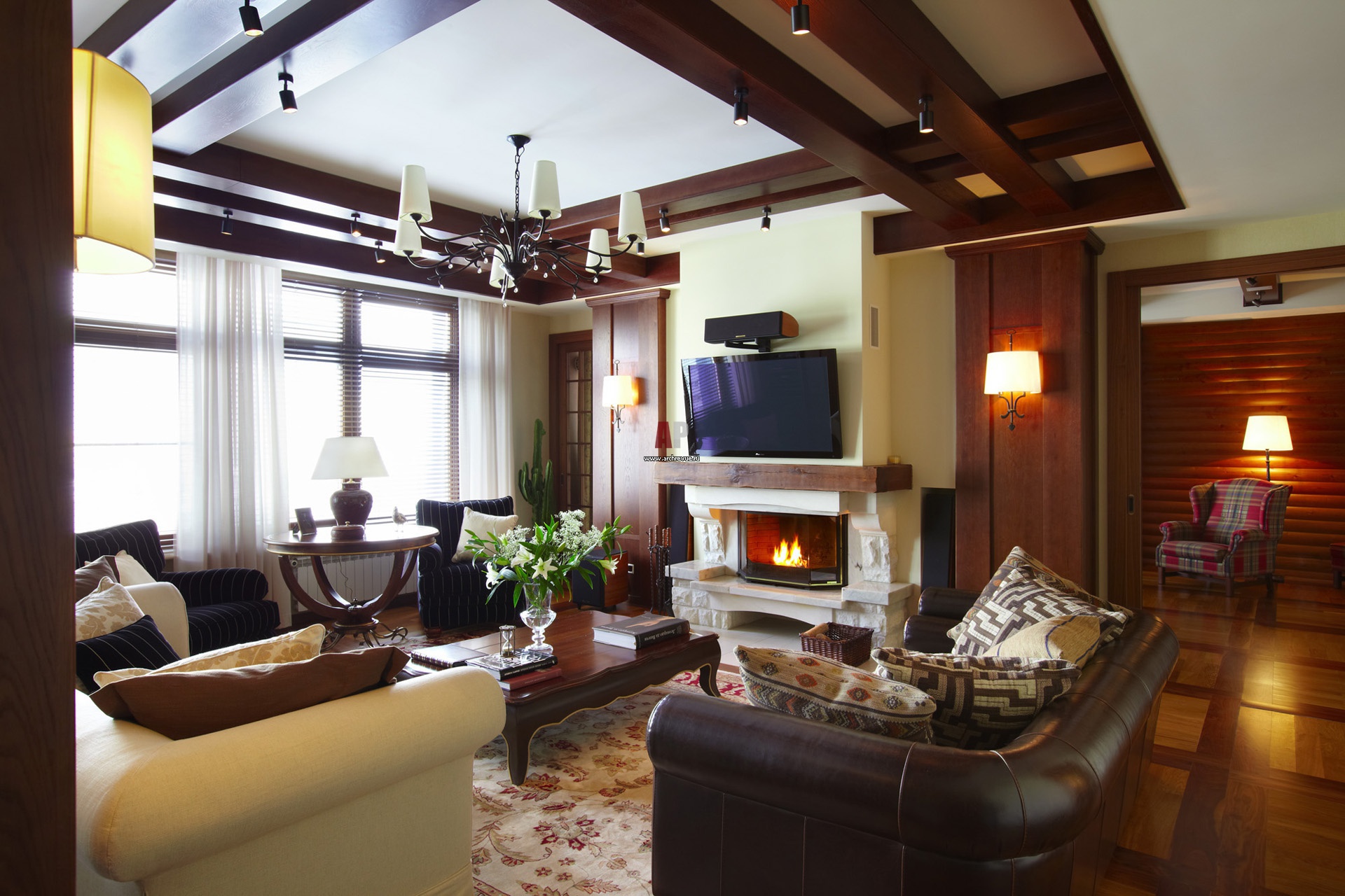 Каминный зал – ядро квартиры. По обе стороны от камина – раздвижные двери (за ними – столовая), поэтому помещение можно обойти по кругу. Одна из стен столовой зашита досками блок-хаус, имитация бревенчатой кладки вносит в интерьер уют.