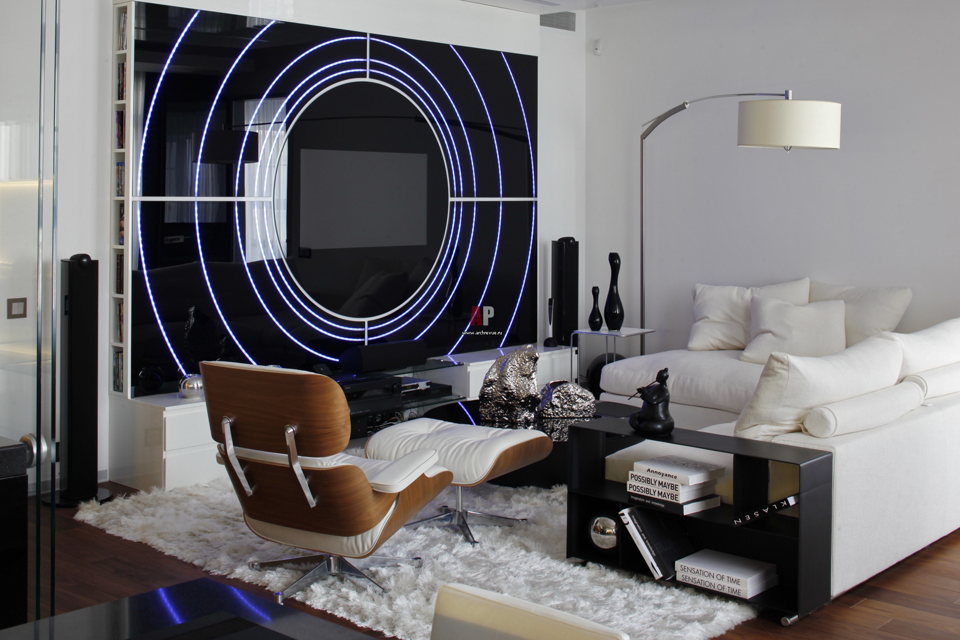 Домашний кинотеатр исполнен как арт-объект. Жидкокристаллическая плазменная панель Ad Notam встроена в конструкцию из черного стекла со встроенными светодиодами. В выключенном состоянии экран становится невидимой частью черной панели. Конструкция изготовлена по эскизам архитекторов мастерами компании LETO.