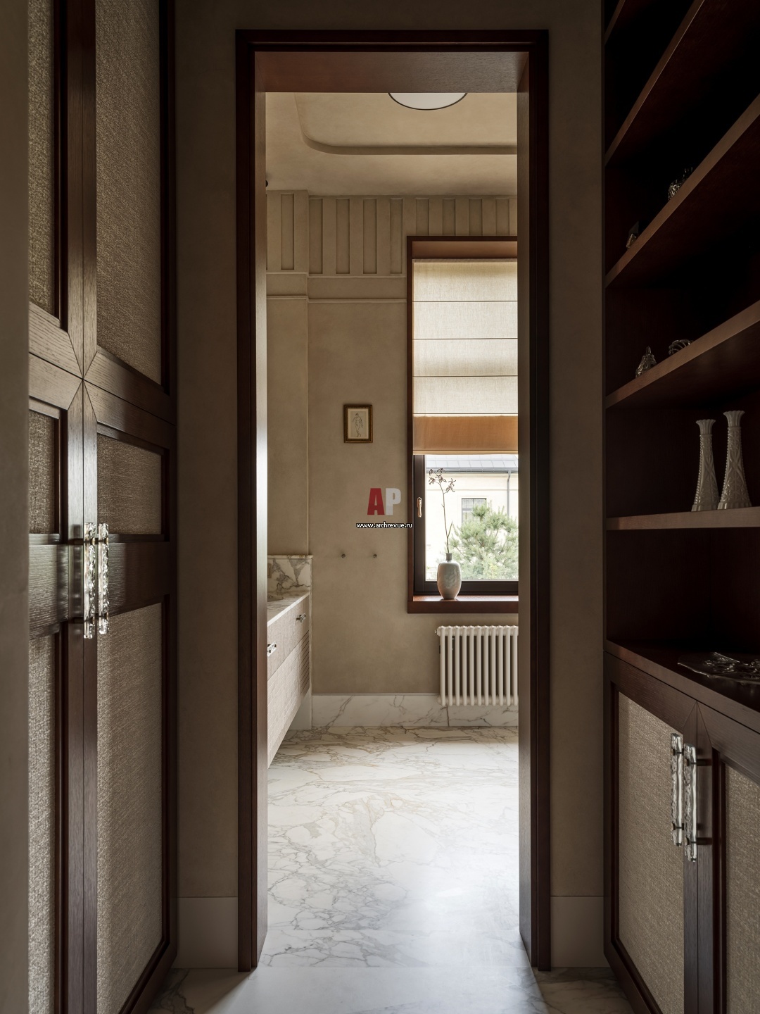 Проходная гардеробная. Встроенные шкафы, фасад шпон сикоморо и вставки из текстильных обоев, Yana Svetlova Wallcoverings.