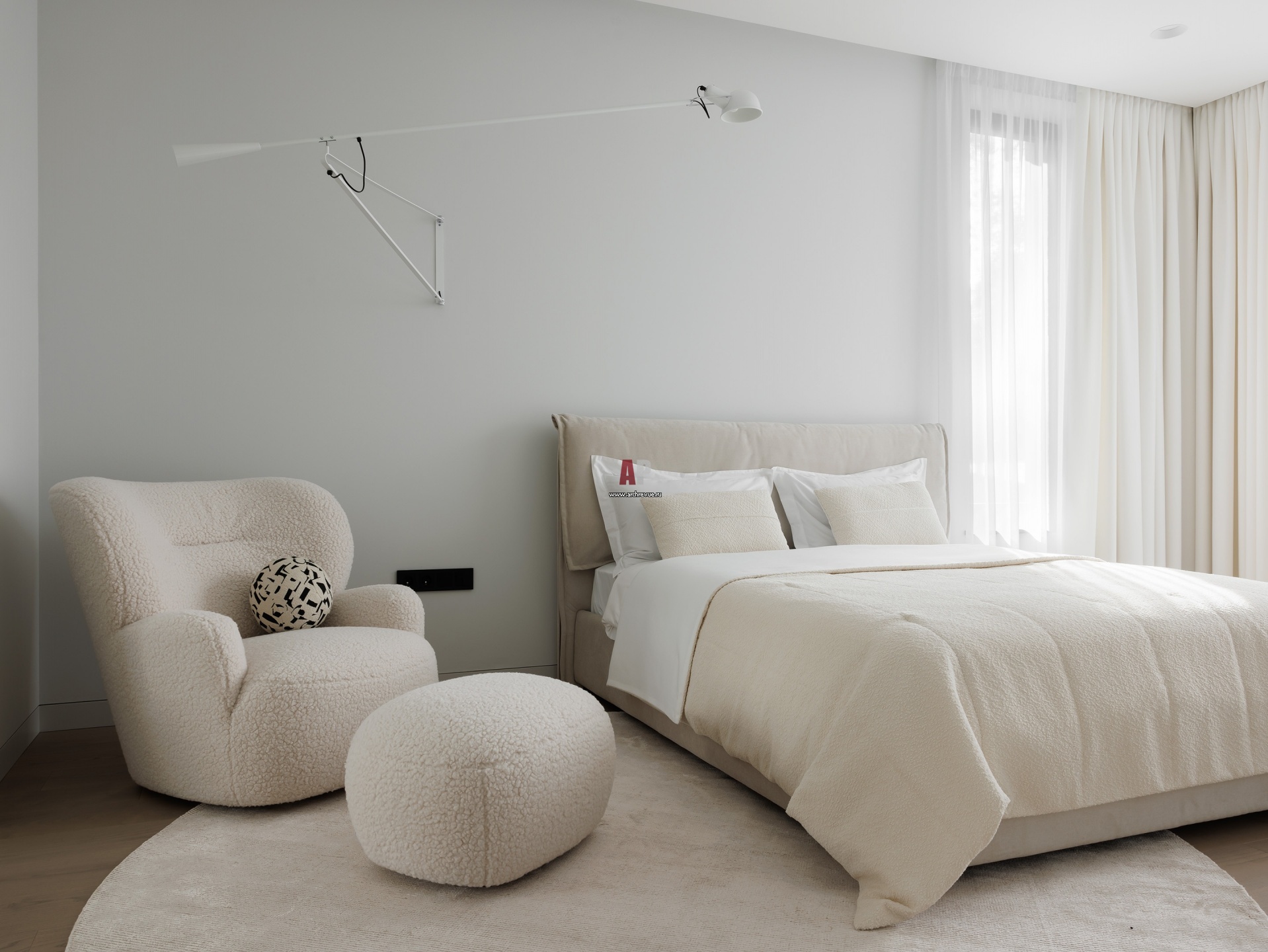 Гостевая спальня на втором этаже оформлена в белых тонах. Со временем она трансформируется во вторую детскую комнату. Кресло, Gervasoni.