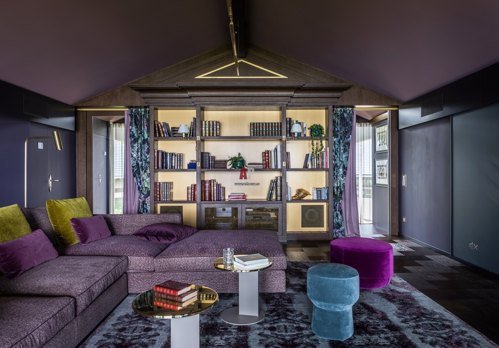 Верхний, мансардный этаж – единое помещение с домашним кинотеатром, баром и библиотекой. Рядом с ним находится небольшой гостевой санузел. Книжный шкаф выполнен на заказ по эскизам дизайнера. Угловой диван, Flexform, модель Richard. Столики и пуфы, Moroso. Кожаное кресло, Rolf Benz.